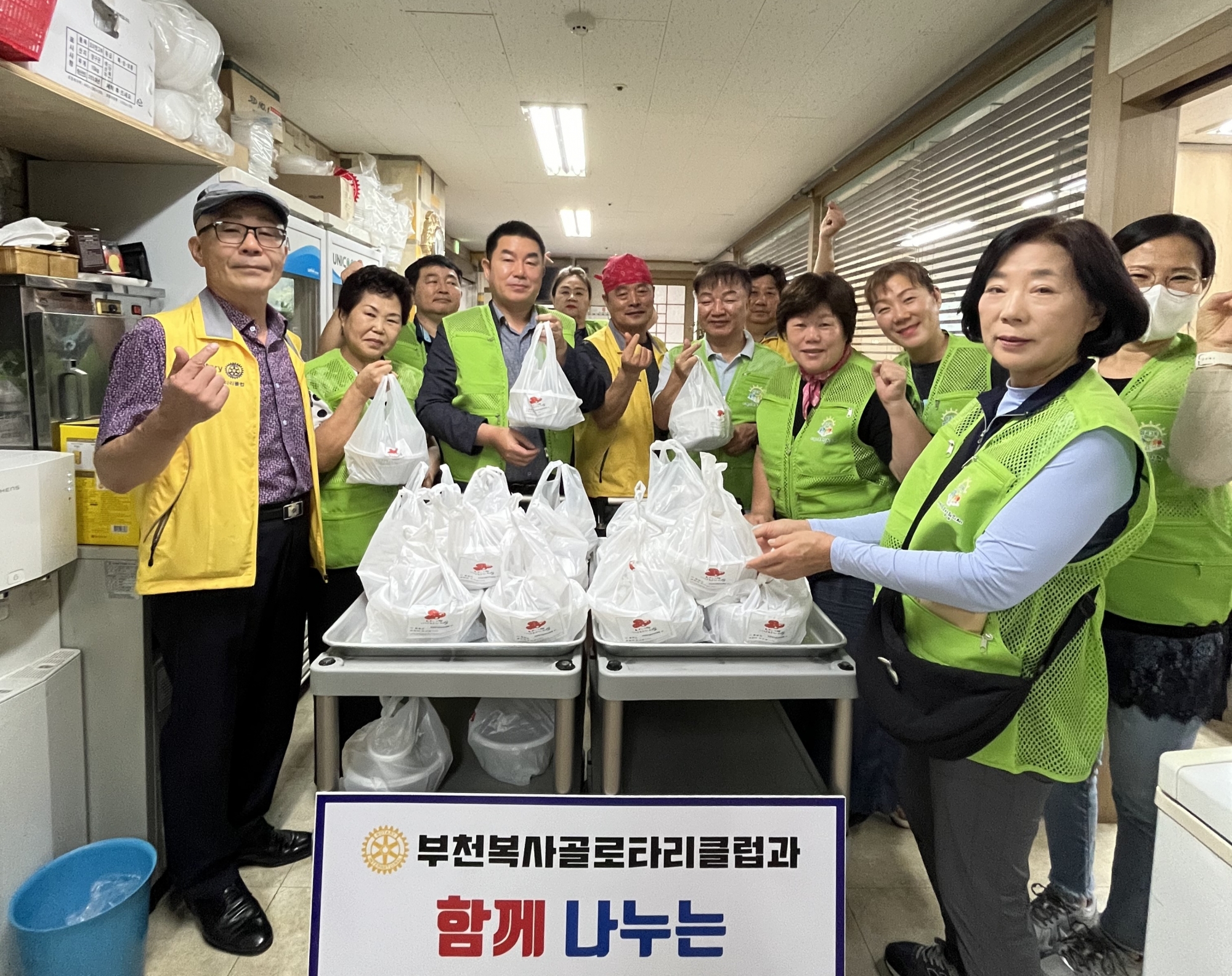 본클럽에서 매월 셋째주 수요일 회장(평관 최동경) 사업장 황제오리에서 한방삼계탕 60개를 준비하여 부천심곡동 거주하신 독거어른신및 취약계층어른신께 심곡동 복지회 협조로