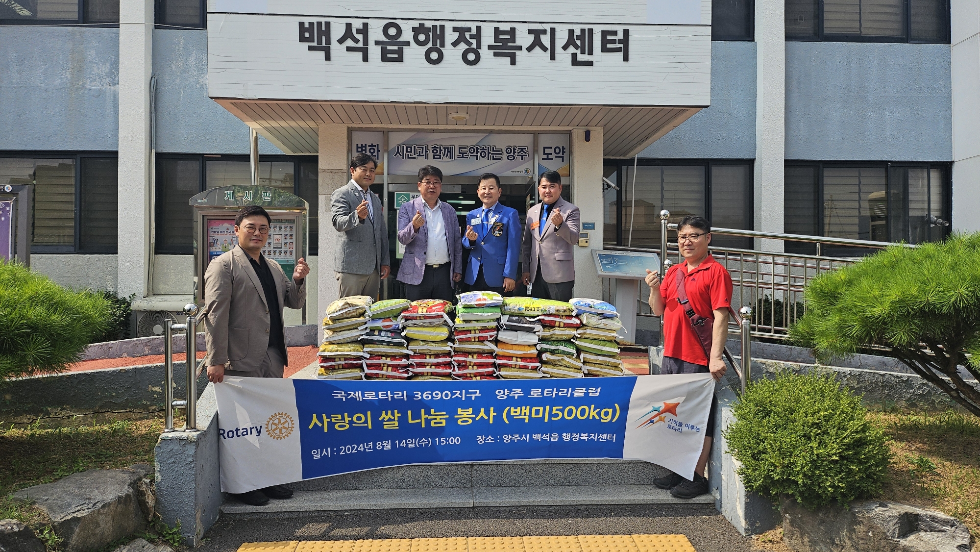 내용 : 양주 로타리클럽에서 지난 달 14일에 어려운 이웃에게 사랑의 쌀 나눔 실천 두번째로 백석 행정복지센터에 백미 500kg를 기탁하였다.