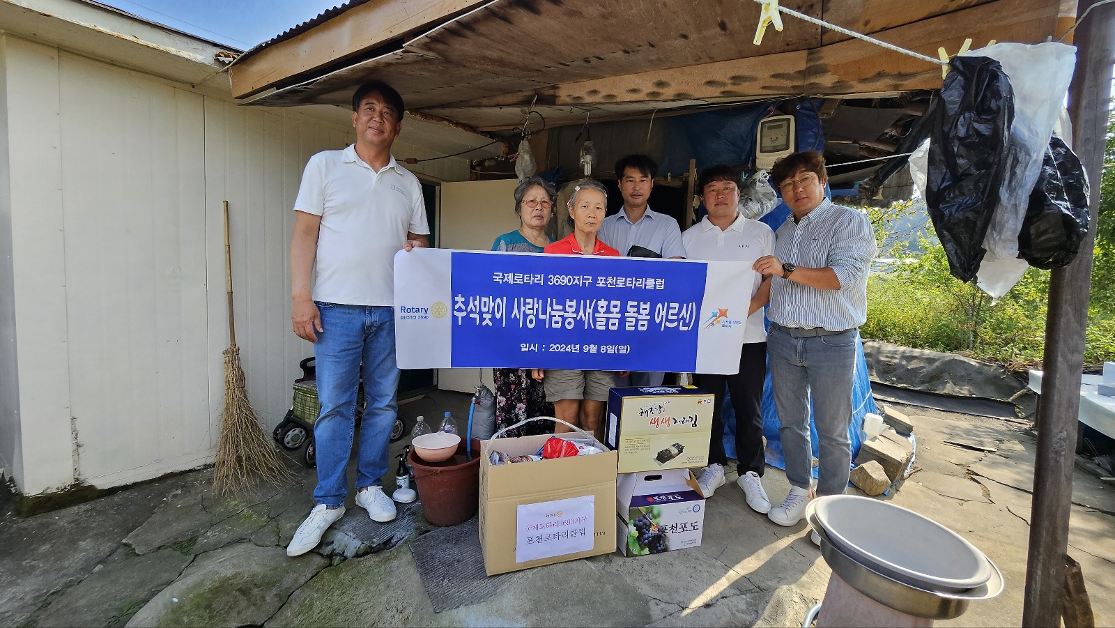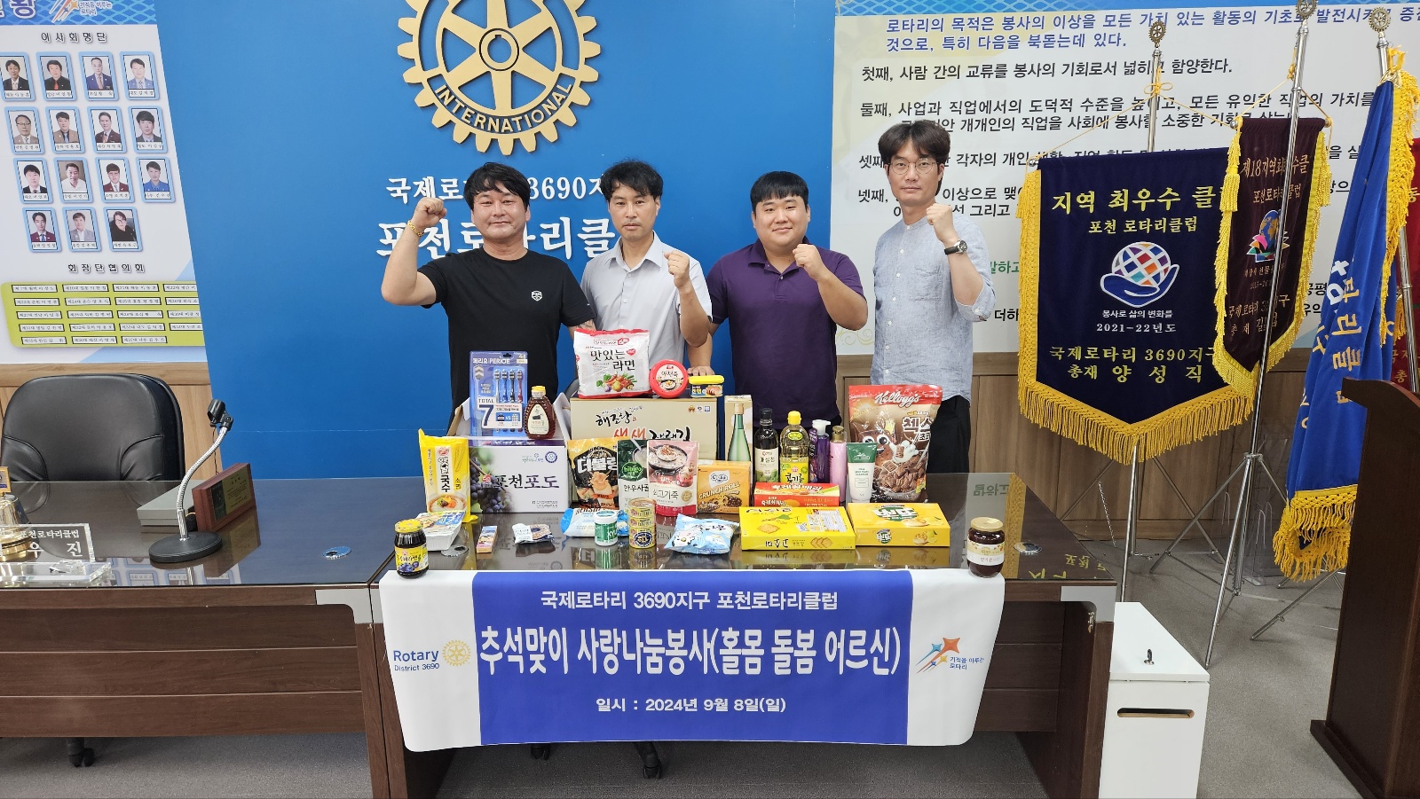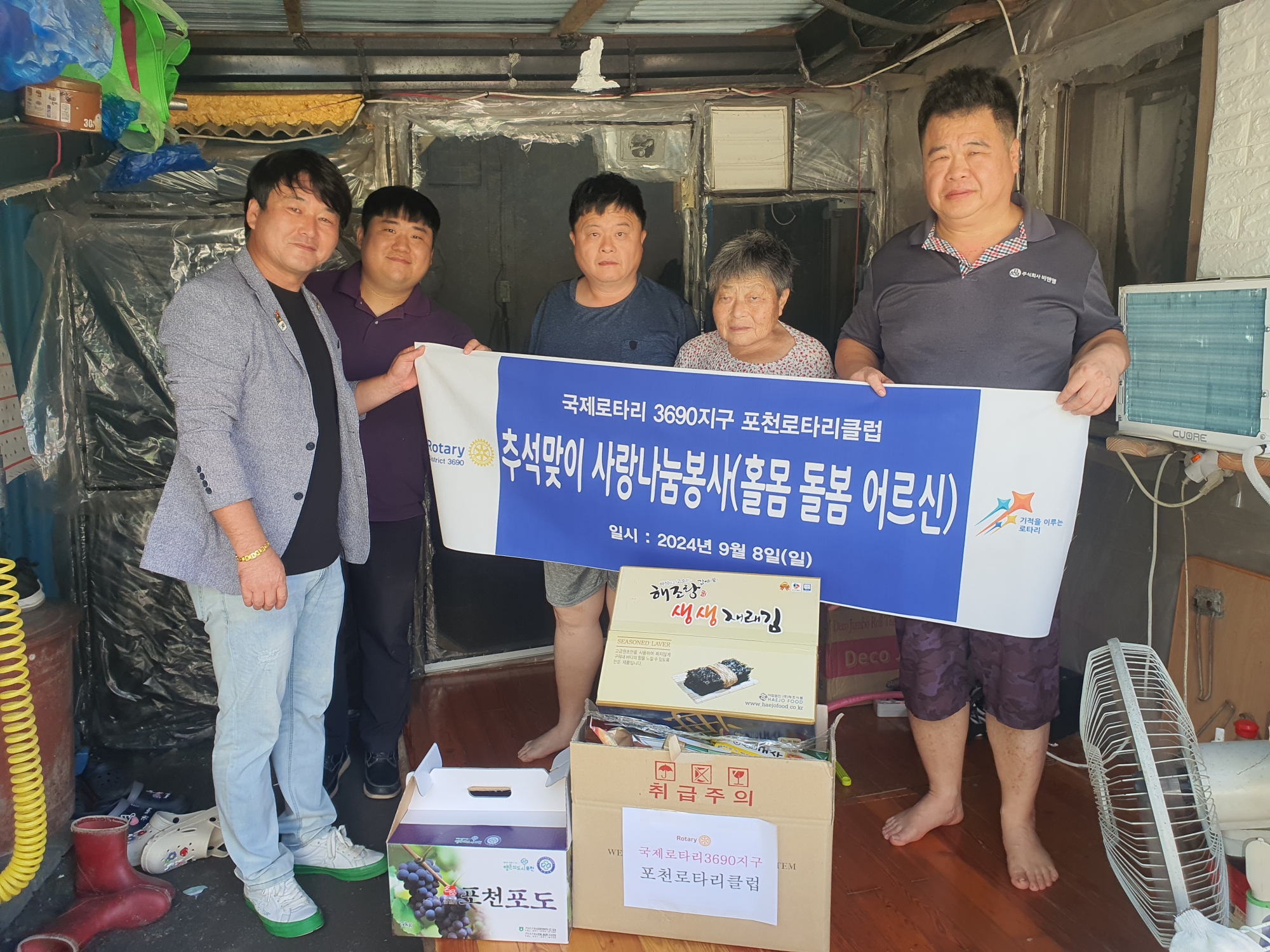 내용 : 포천RC(나루 김우진 회장, 송강 김종택 총무)은 다가오는 추석 명절을 맞아 러브하우스 2,3,5호 어르신들과 선단동 , 가산면 어르신, 주거환경개선사업을 했었던 홀몸 어르신댁과 장애인 가족 등 총 8가구에 물품(포도, 김 등)을 전달하였습니다.
