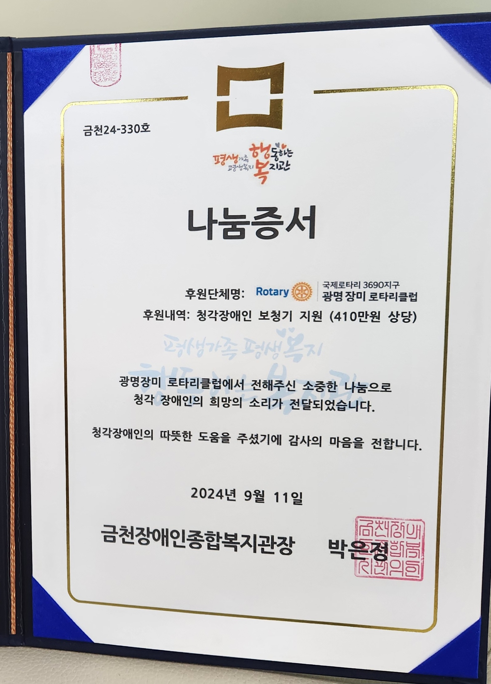 ■내용: 금천구 장애인 복지관을 이용하시는 어르신(청각장애인)의 보청기가 노후되어 소리가 잘 들리지않아 소통이 어렵고 현재 차사위계층으로 보청기를 구입할 경제적인 형편이 여의치 않던중 세탁기에 보청기를 옷과 함께 세탁하던중 더 이상 수리도 불가능 하다는 사연을 접하고 새 보청기를 후원해 드렸습니다.
