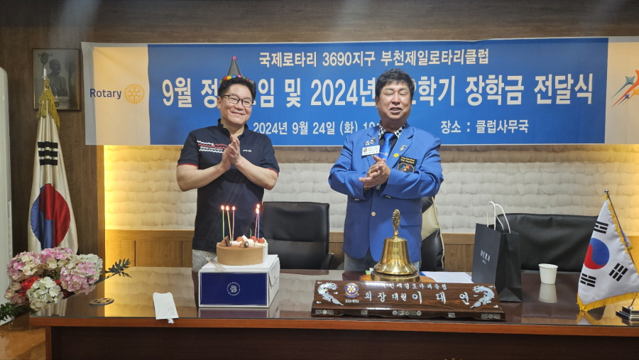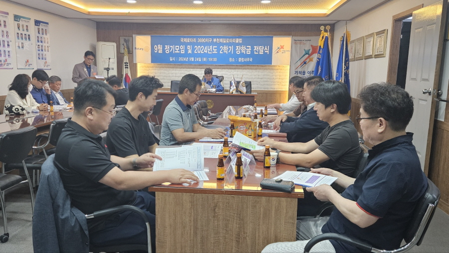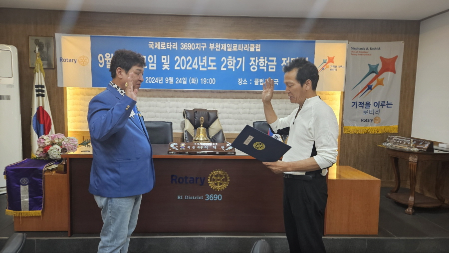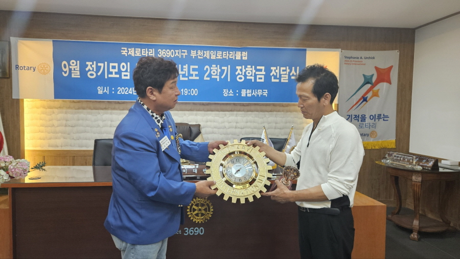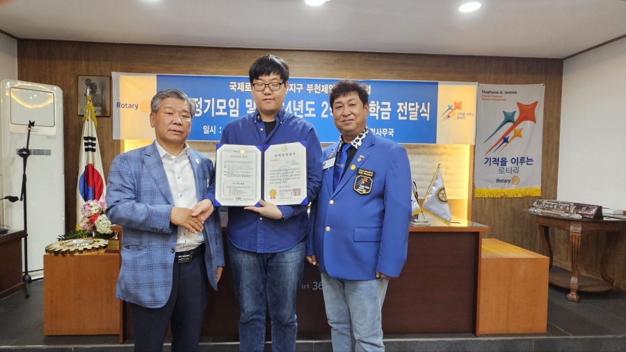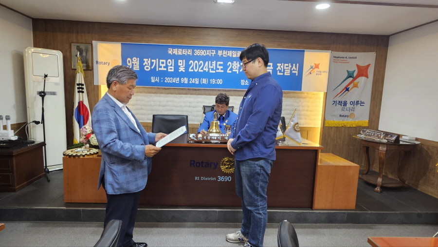 부천제일로타리클럽(회장 대월 이대연)은 9월 24일 저녁7시. 클럽사무국에서 2024년도 2학기 장학금 (대환 김명현 전회장 관명장학금)을 국민대학교 이성진 학생에게 정기모임시 장학증서와 함께 전달하였다.