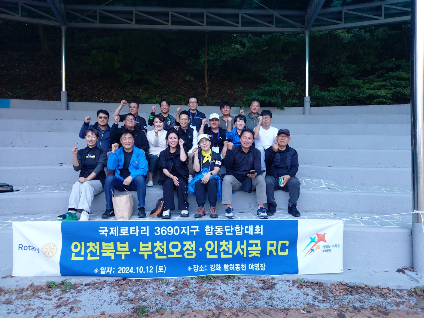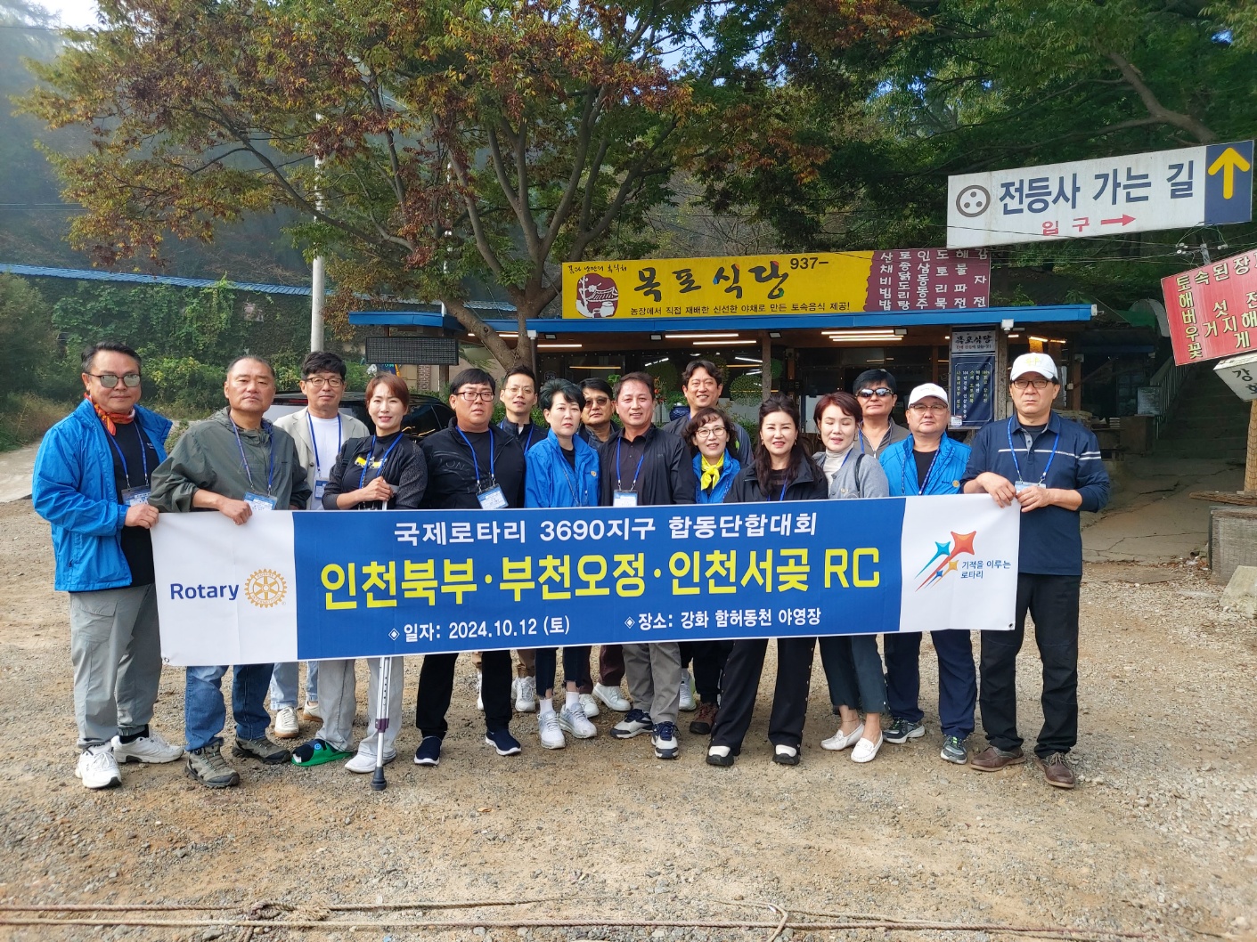 -내용: 인천북부 로타리클럽(회장 이종선)은 자매클럽인 부천오정 RC, 인천서곶 RC이 친목을 다지고자 합동 단합대회를 개최하였다. 김상욱 인천3지역, 강병하 부천2지역 총재지역대표님들의 버스 협찬으로 전등사에 들러 경내를 둘러보고 함허동천 야영장에서 정성스럽게 준비해온 음식과 게임, 족구를 하면서 가을 단풍과 함께 즐거운 시간을 보냈다.
