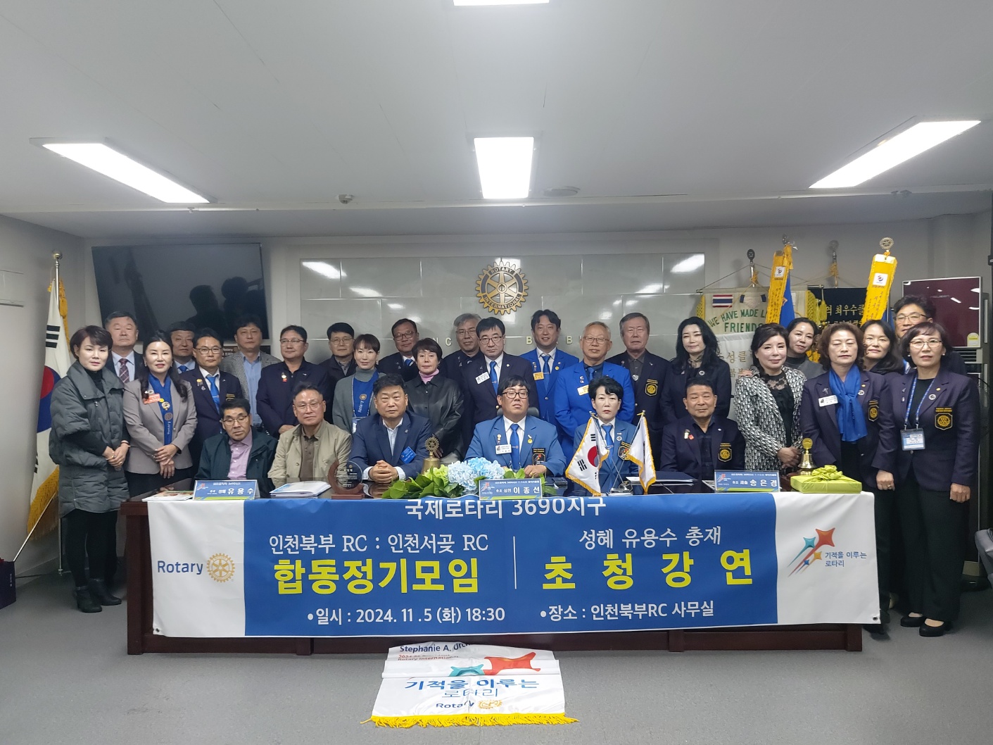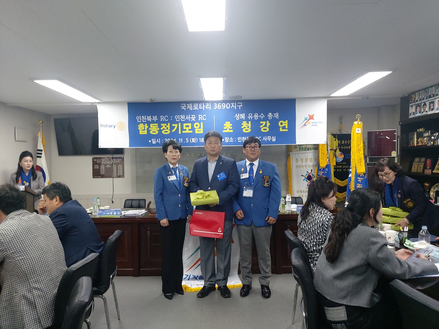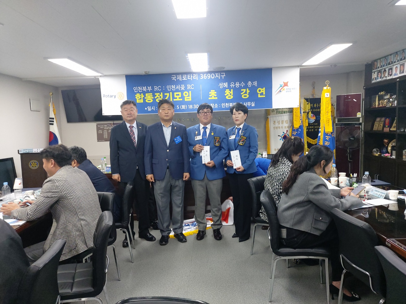 -내용: 인천북부 로타리클럽(회장 상천 이종선)은 자매클럽인 인천서곶 로타리클럽과 합동 정기모임을 개최하여 성혜 유용수 총재님의 초청강연 시간을 가졌습니다. 로타리클럽의 탄생과 정의, 회합, 효율적인 클럽의 역할을 하는 회장,총무의 마음가짐에 대해 준비해 오신 자료를 통해 강연을 해주셨습니다. 앞으로도 양 클럽의 우의와 친목을 지속적으로 유지하기 위한 교류를 자주 갖기로 다짐하였습니다.
