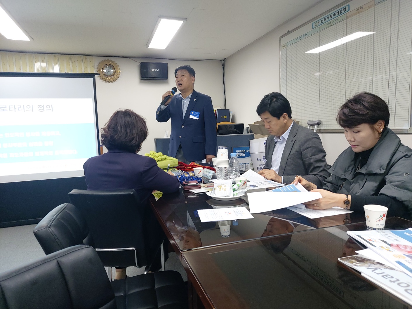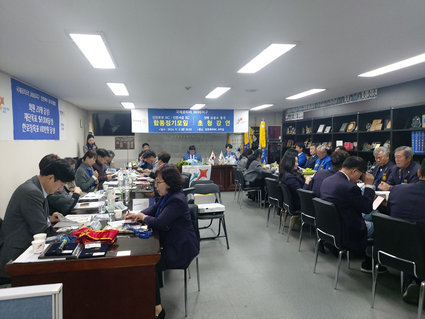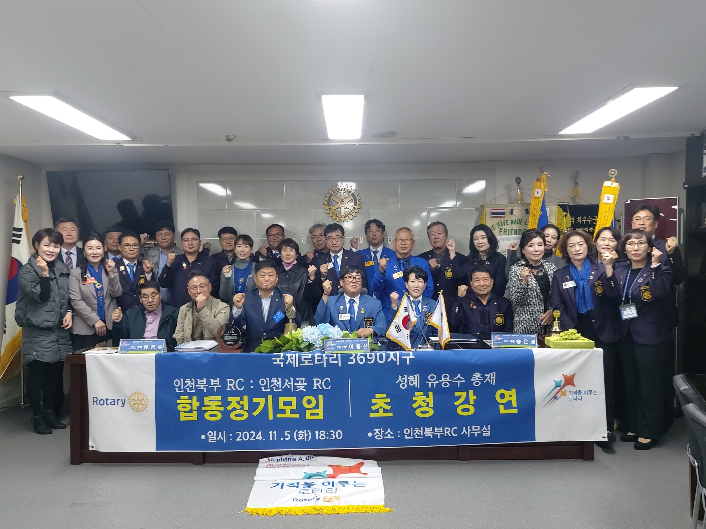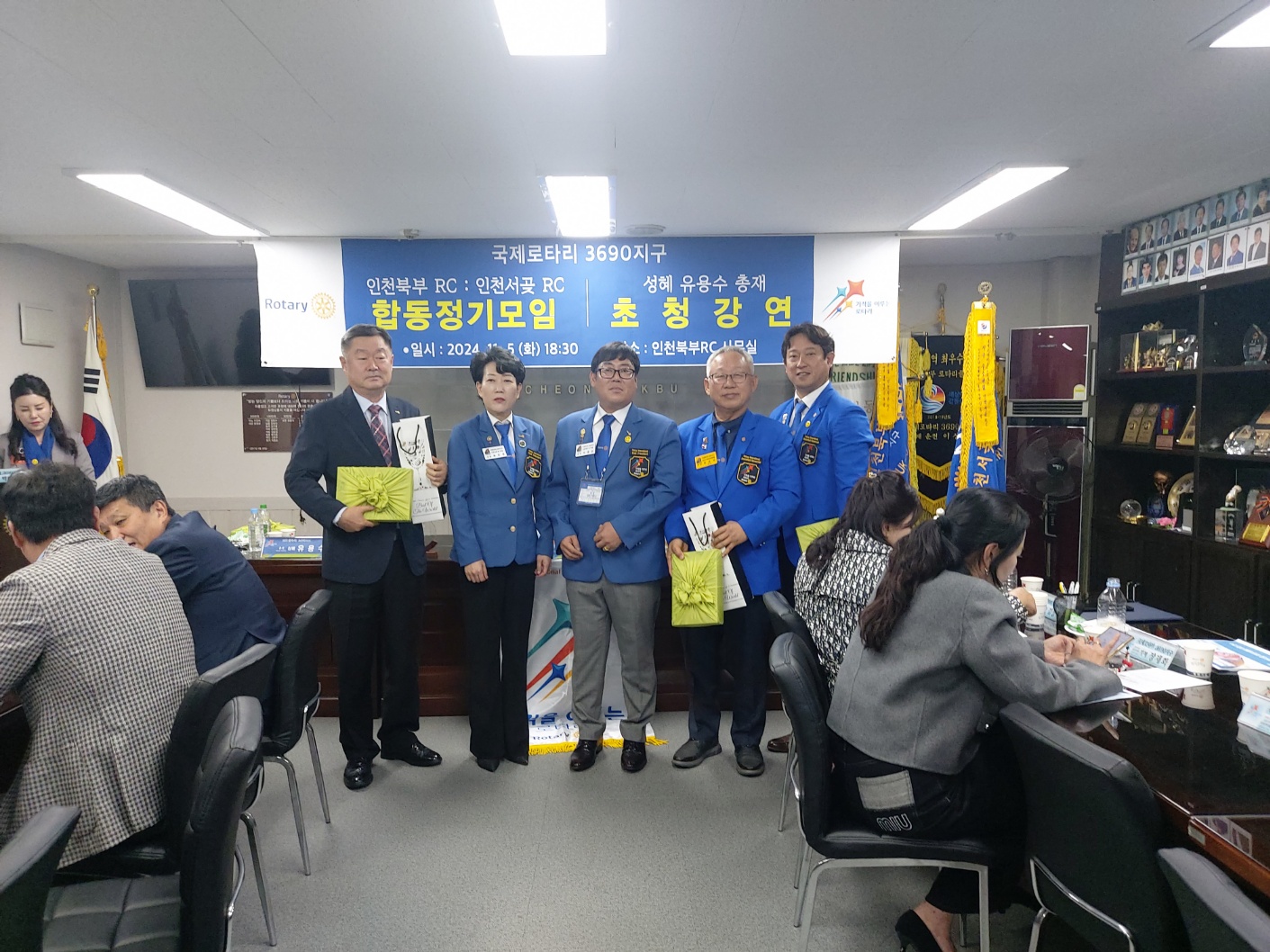 -내용: 인천북부 로타리클럽(회장 상천 이종선)은 자매클럽인 인천서곶 로타리클럽과 합동 정기모임을 개최하여 성혜 유용수 총재님의 초청강연 시간을 가졌습니다. 로타리클럽의 탄생과 정의, 회합, 효율적인 클럽의 역할을 하는 회장,총무의 마음가짐에 대해 준비해 오신 자료를 통해 강연을 해주셨습니다. 앞으로도 양 클럽의 우의와 친목을 지속적으로 유지하기 위한 교류를 자주 갖기로 다짐하였습니다.