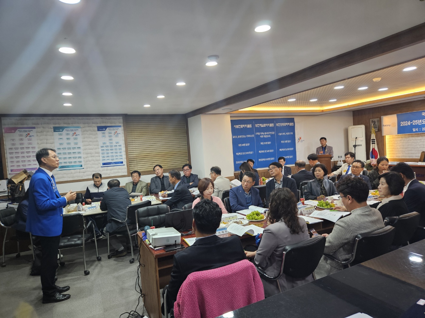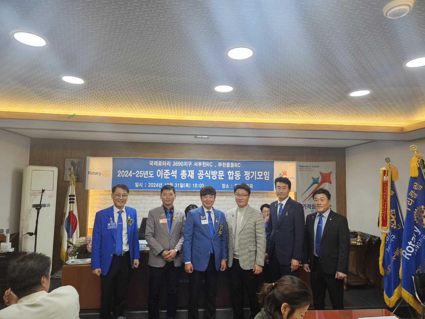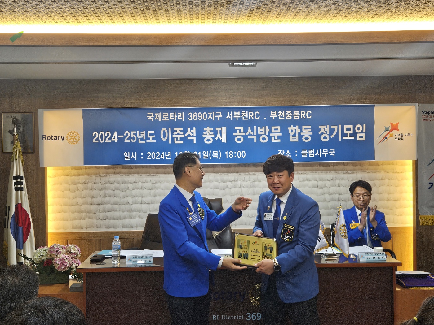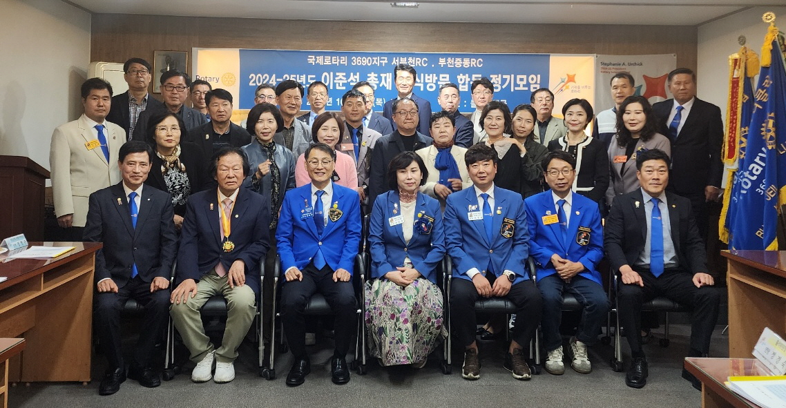 내용 : 부천중동로타리클럽(회장: 이광현)과 서부천로타리클럽(회장: 정민주)이 합동 이준석 총재 공식방문 정기모임을 개최하여 최천희 부천3지역대표님과 이영희 부천2지역 부지역대표님, 정형관 부천3지역 부지역대표님, 이종희 의전위원님이 참석하여 클럽협의회와 정기모임이 진행되었다.