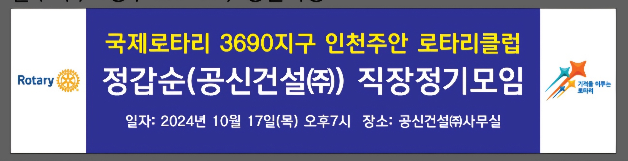 인천주안 로타리클럽(회장 강재호)는 10월 17일 정갑순 부회장님의 공신건설에서 직장 정기모임을 가졌습니다. 공신걸설은 관공서 및 전국 각지에서 토목, 건설 사업을 활발히 하고 있습니다.