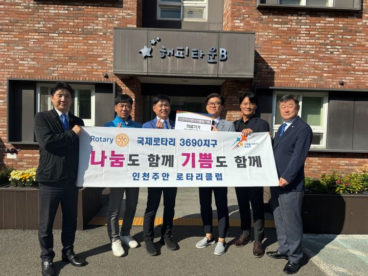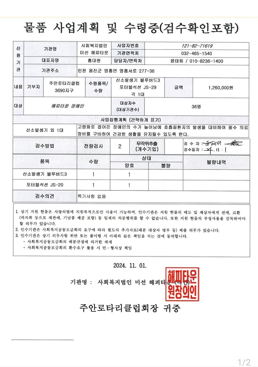 인천주안 로타리클럽(회장 강재호)은 10월 30일 해피타운(영흥도-중증장애인 시설)에 산소발생기와 석션기(126만원)를 후원하였습니다. 장애인 50여명이 생활하는 곳이라 꼭 필요로 하는 물품을 후원하면서 로타리의 초아의 봉사에 대해 다시 생각하면서 봉사할 수 있음에 감사함을 느끼는 시간이었습니다.