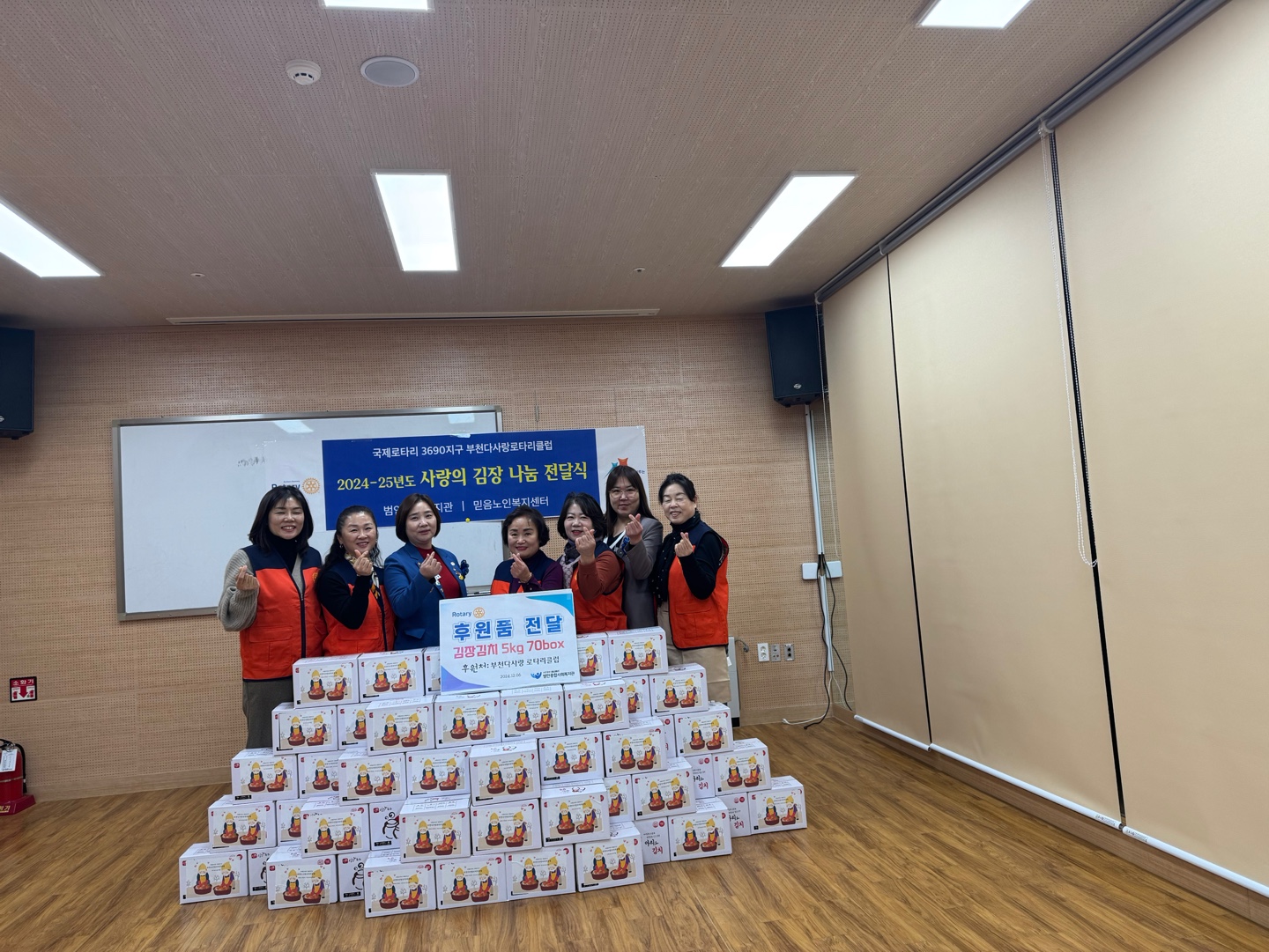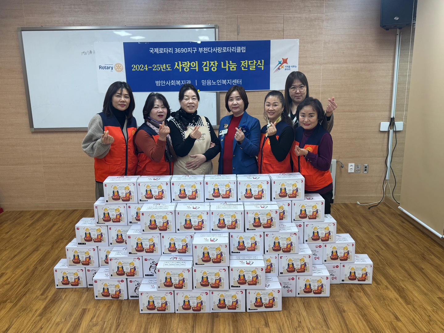 부천다사랑RC 회장(몽 이남용)은 2024.12. 10(화) 저소득층 및 독거노인어르신들에게 사랑의 김장 김치를 나눠 드리라고 5kg 130박스 범안사회종합복지관 및 믿음노인복지센터에 전달하였습니다.