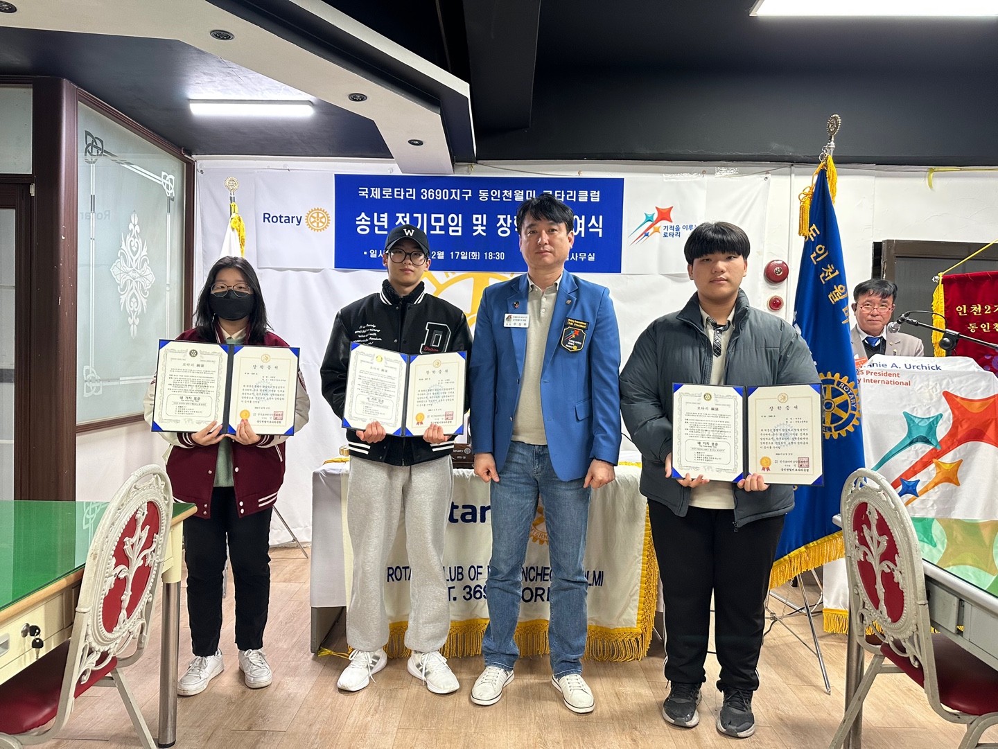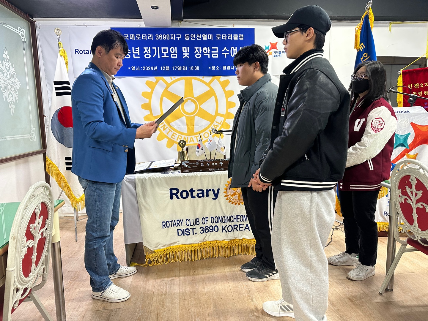 2024. 12. 17(화) 동인천월미로타리클럽은 송년정기모임을 통하여 고등학생 3명에 각 40만원의 장학금과 장학증서를 전달하였습니다.