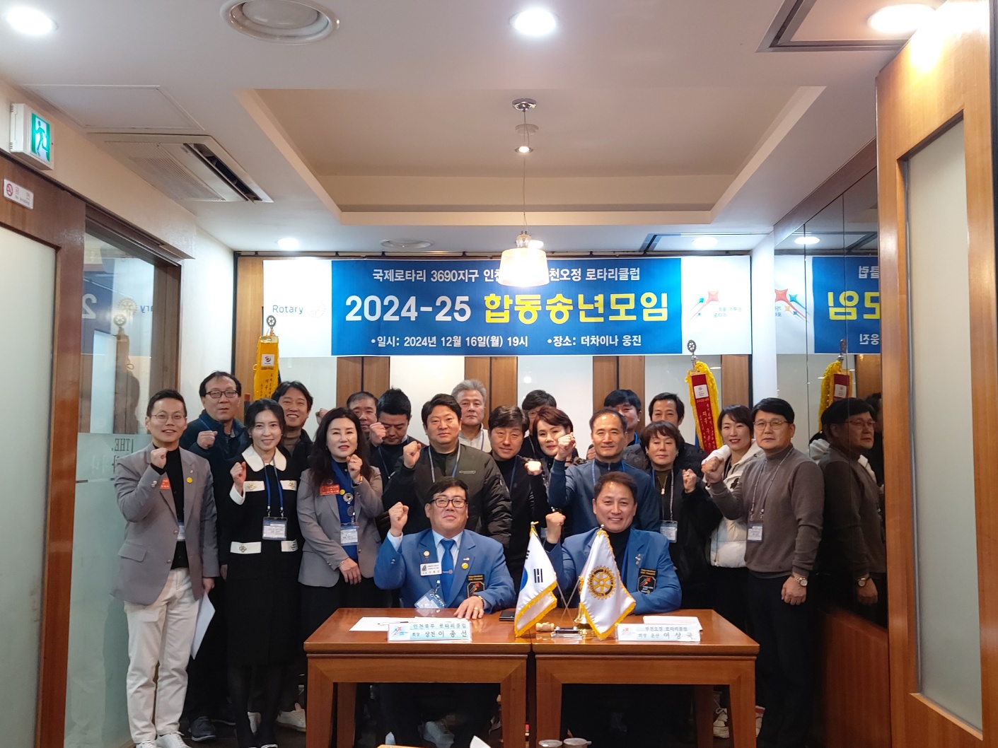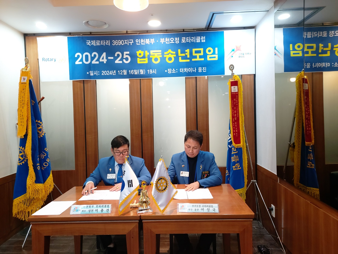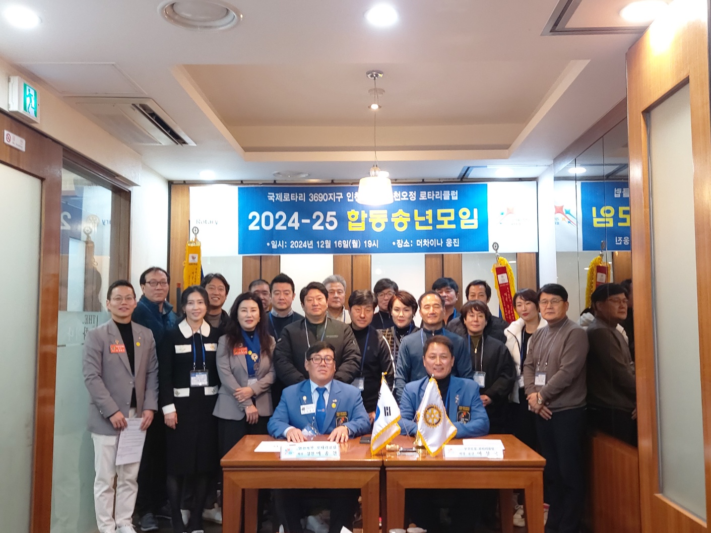 -내용: 인천북부로타리클럽(회장 상천 이종선)은 자매클럽 부천오정 로타리클럽과 합동으로 송년모임을 개최하였습니다. 양 클럽 회원이 한자리에 모여 우정을 나누면서 더욱 가까워지고 화합된 모습으로 계속 나아가기를 다짐하면서 화이팅 하였습니다.