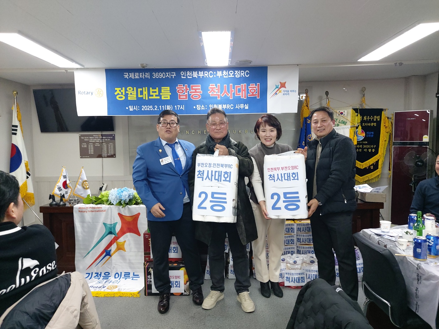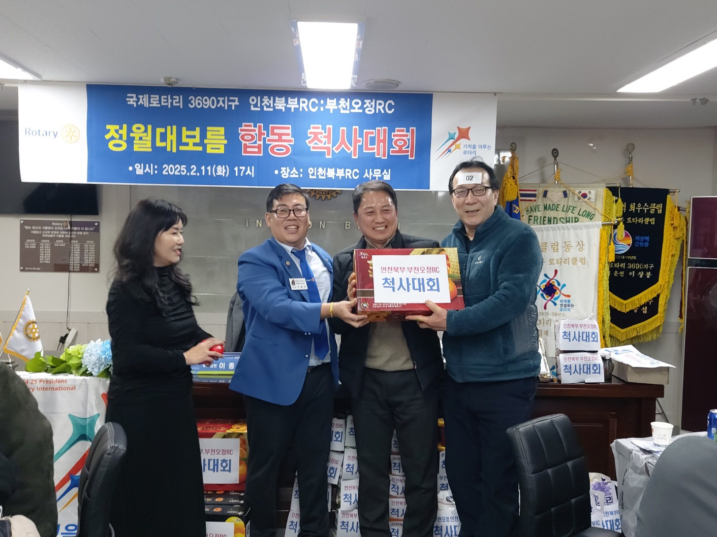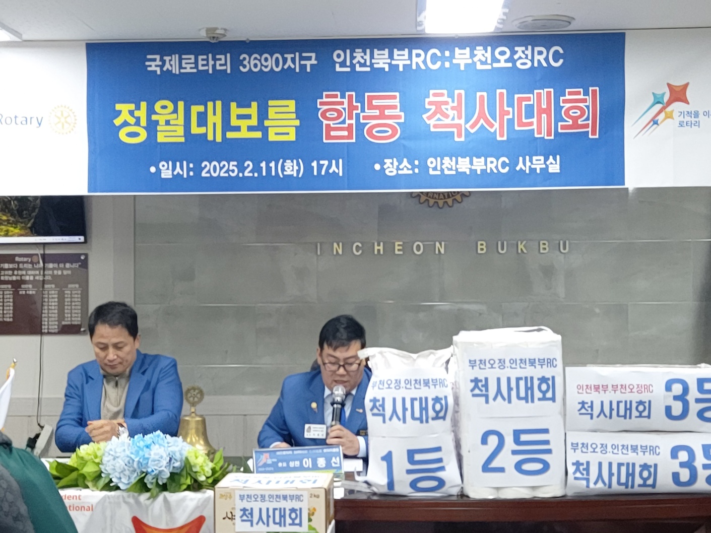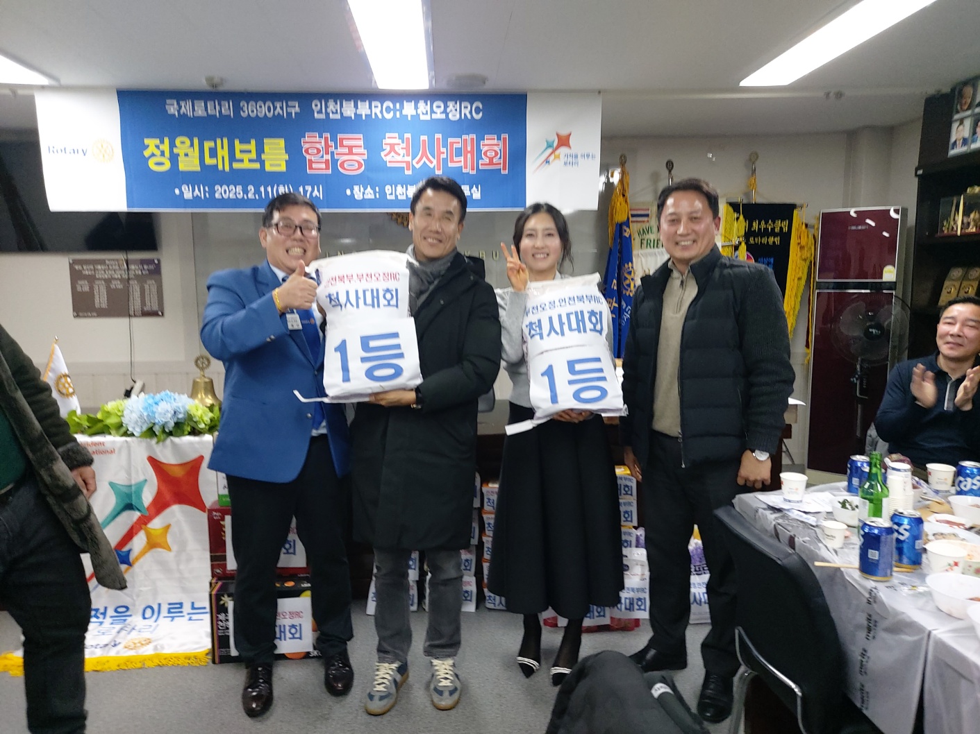 -내용: 인천북부 로타리클럽(회장 상천 이종선)은 자매클럽인 부천오정로타리클럽과 합동 척사대회를 개최하여 양 클럽 회원들이 한자리에 모여 대보름 맞이 음식과 윷놀이, 돌림판 놀이를 통해 올 한해도 무탈하게 잘 지낼 수 있도록 기원하며 단합과 친목의 시간을 가졌습니다.