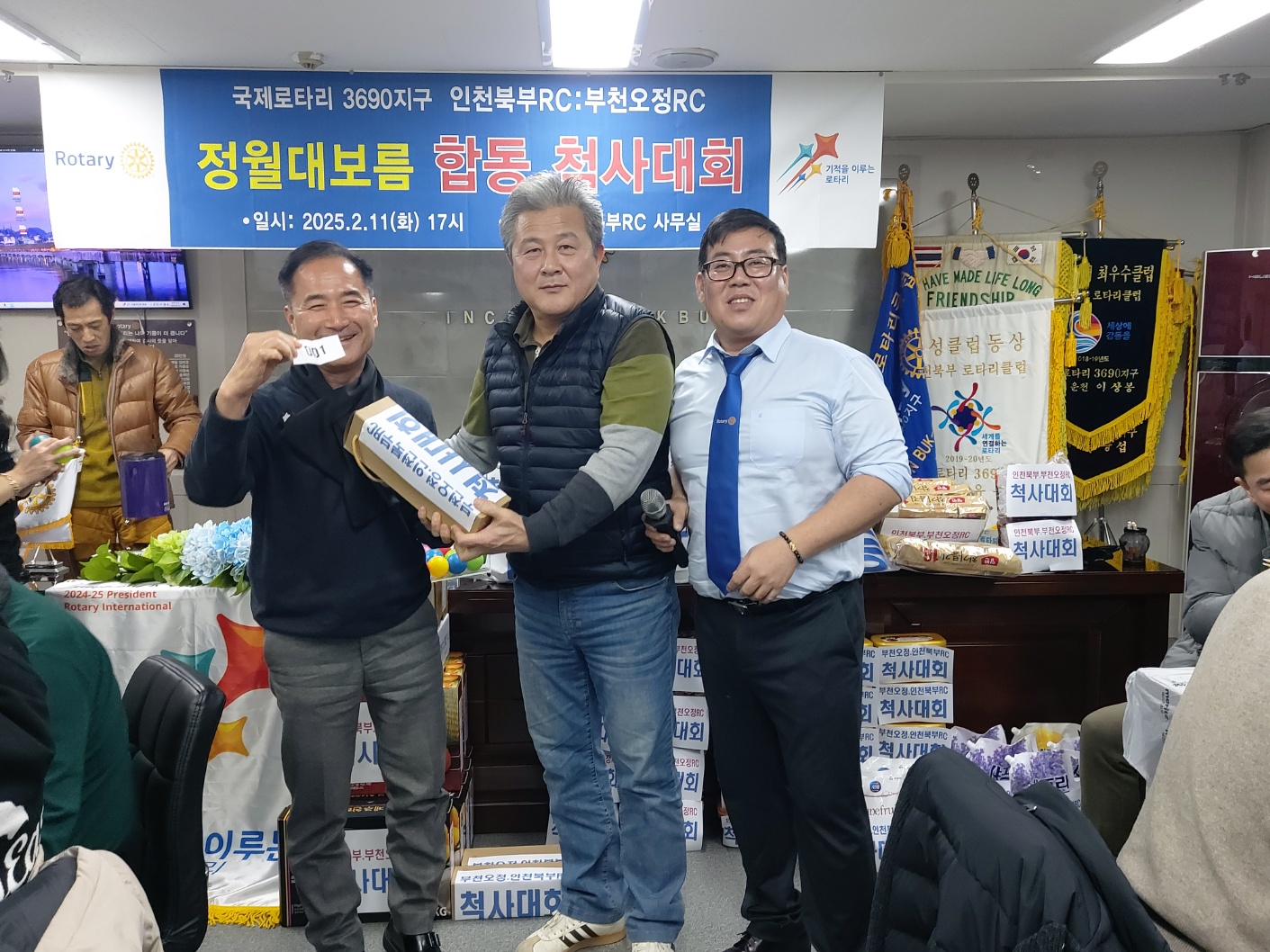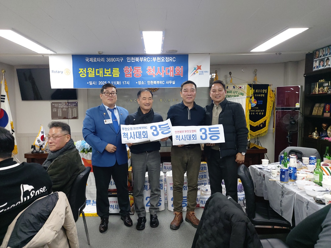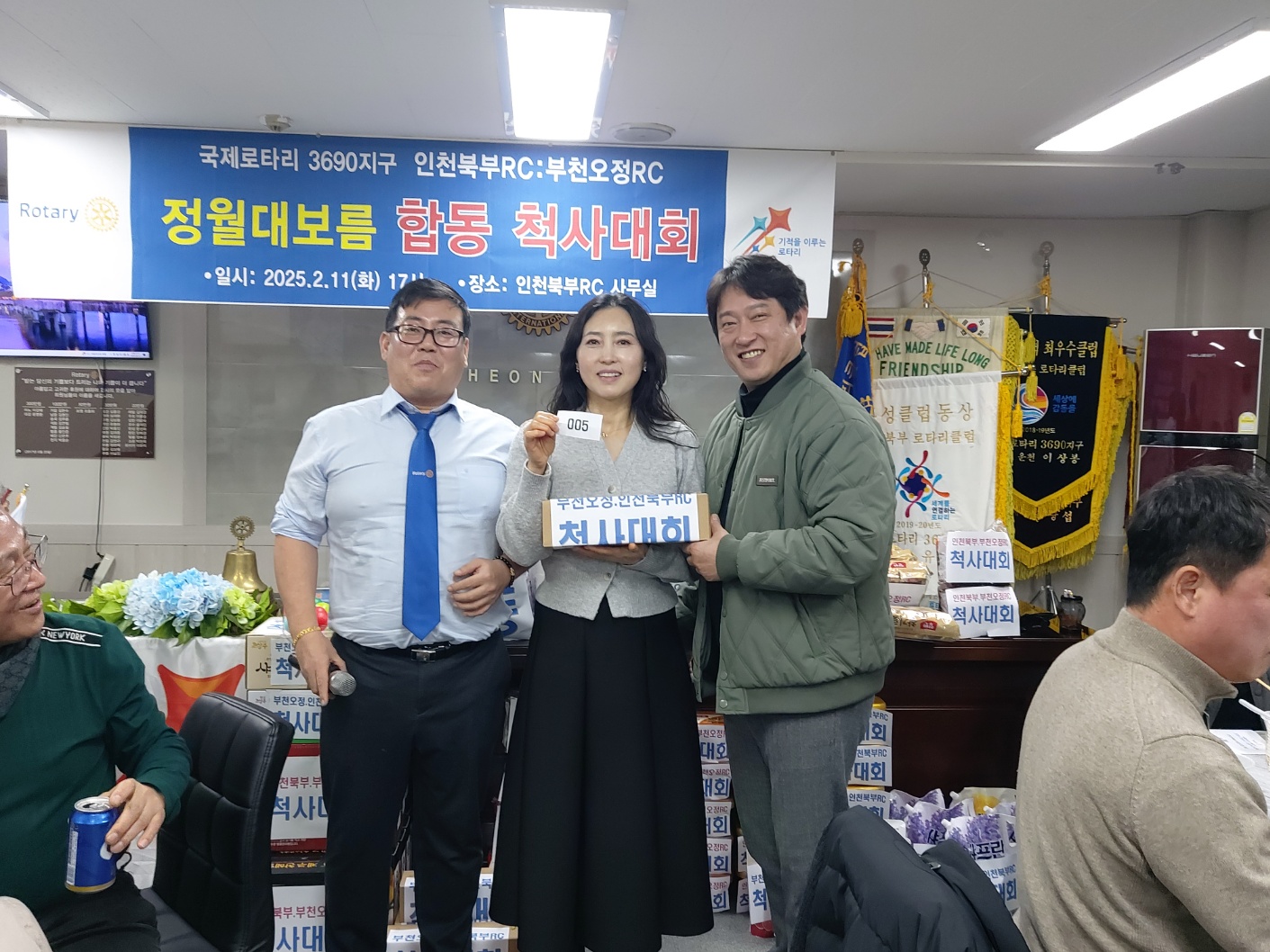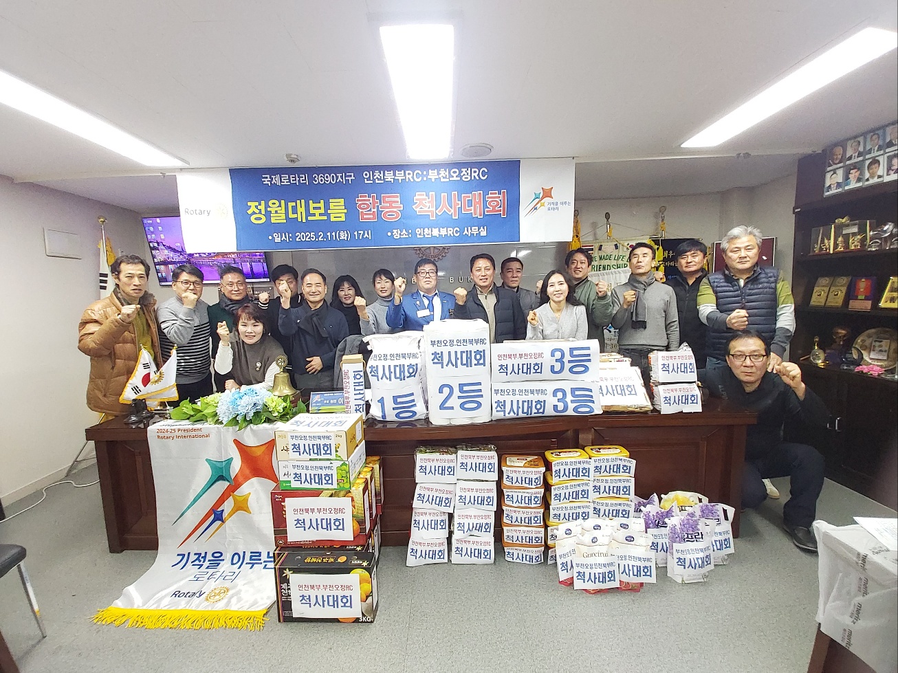 -내용: 인천북부 로타리클럽(회장 상천 이종선)은 자매클럽인 부천오정로타리클럽과 합동 척사대회를 개최하여 양 클럽 회원들이 한자리에 모여 대보름 맞이 음식과 윷놀이, 돌림판 놀이를 통해 올 한해도 무탈하게 잘 지낼 수 있도록 기원하며 단합과 친목의 시간을 가졌습니다.