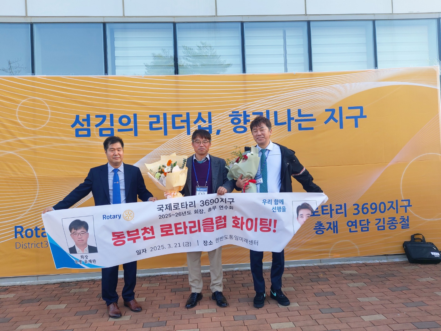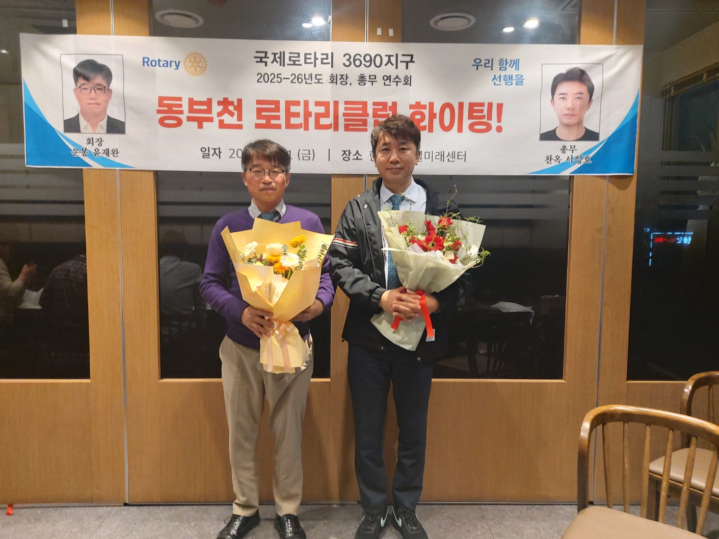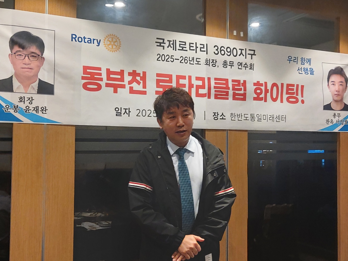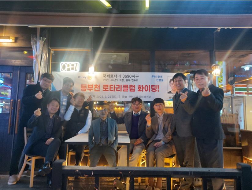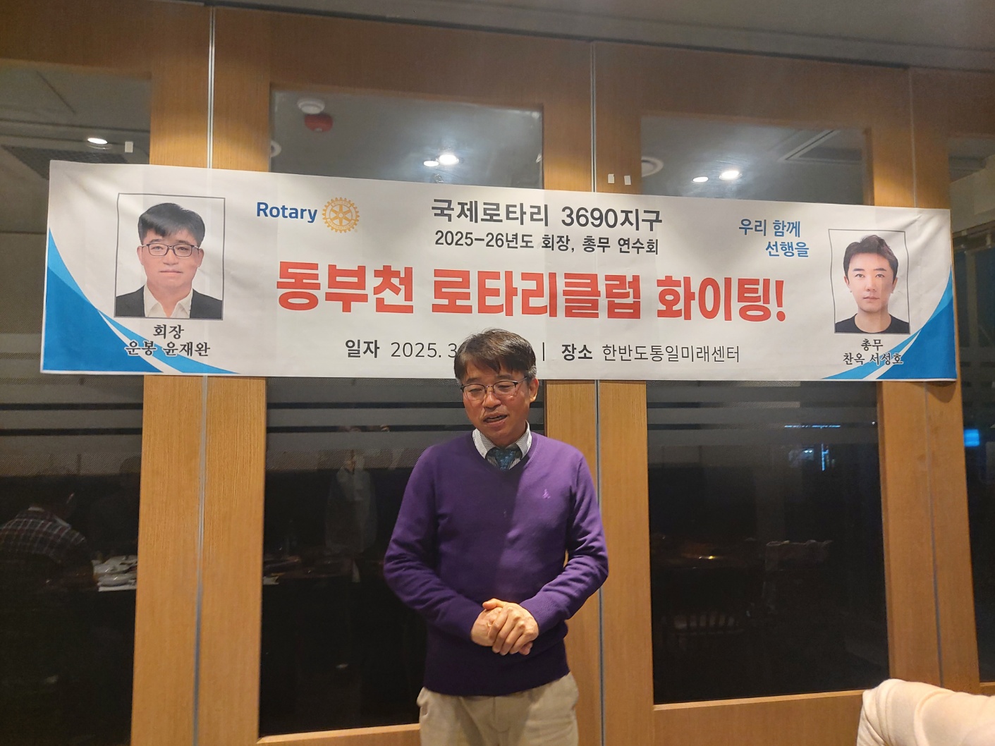 -내용: 동부천로타리클럽(회장 백암 최구현)은 PELS에 참석하여 교육을 받으신 운봉 윤재완 차기회장님과 찬옥 서성호 차기총무님을 응원하고 차기년도에도 클럽을 잘 이끌어 주시기를 당부드리며 여러 회원님들이 참석하여 힘을 실어드리고 화이팅을 하였습니다.