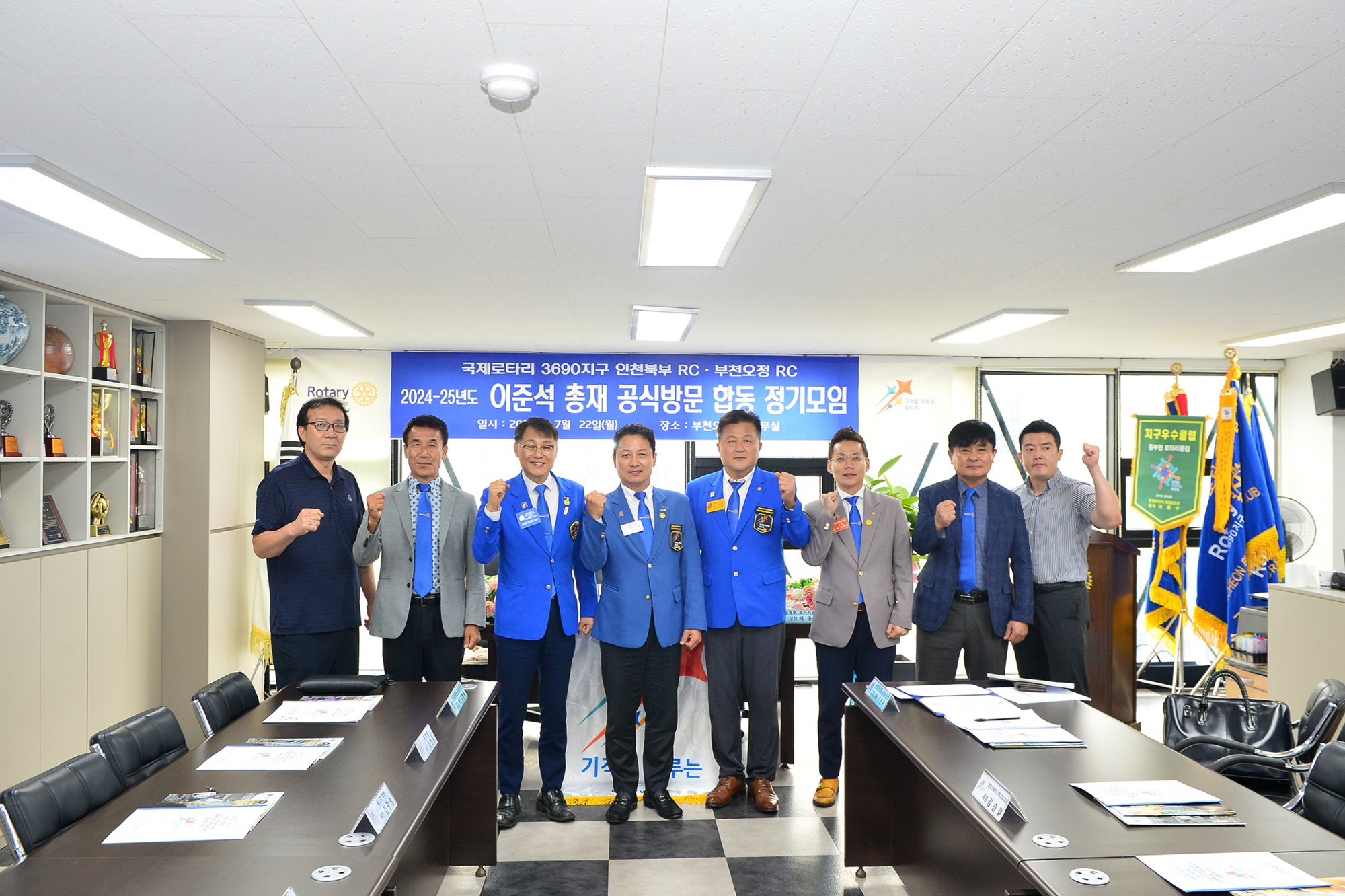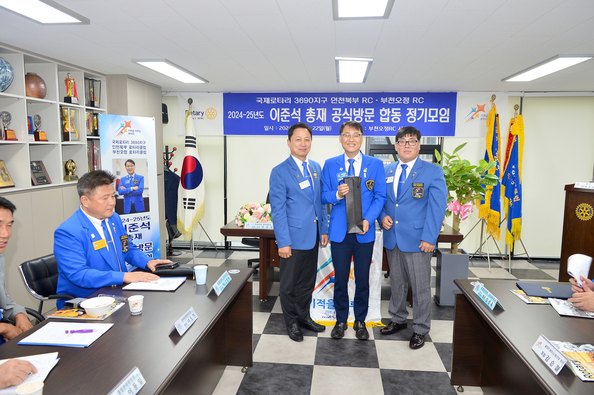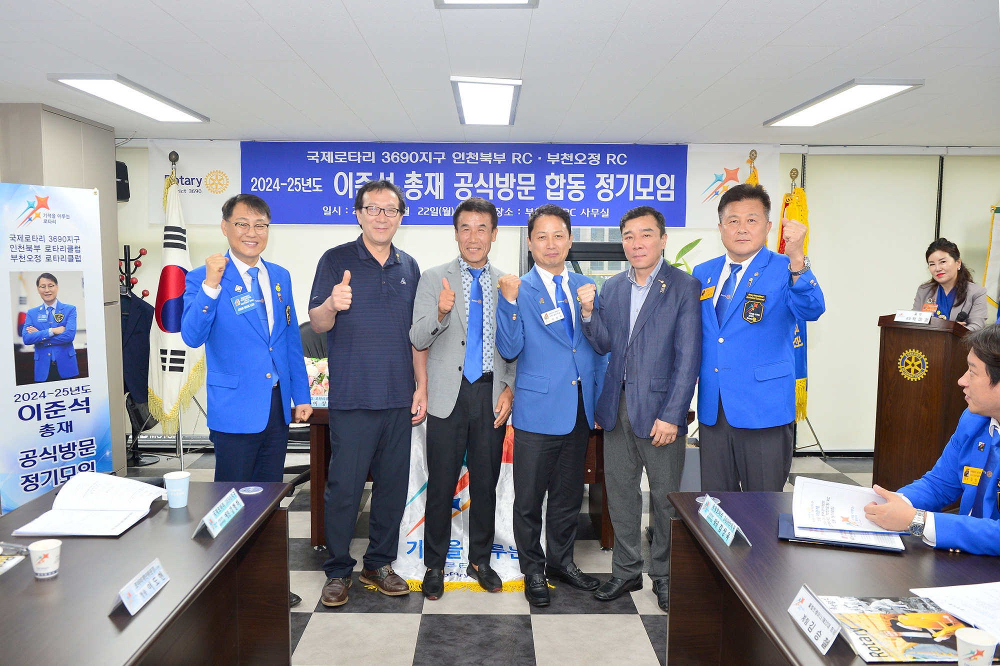 -내용: 부천오정 로타리클럽(회장 운산 이상국)과 인천북부 로타리클럽(회장 상천 이종선)은 자매클럽 합동으로 진일 이준석 총재님의 2024-25년도 첫 총재공식방문을 맞이하여 회장, 총무 간담회와 5대분과 위원회 발표를 하고 합동정기모임을 하였다.