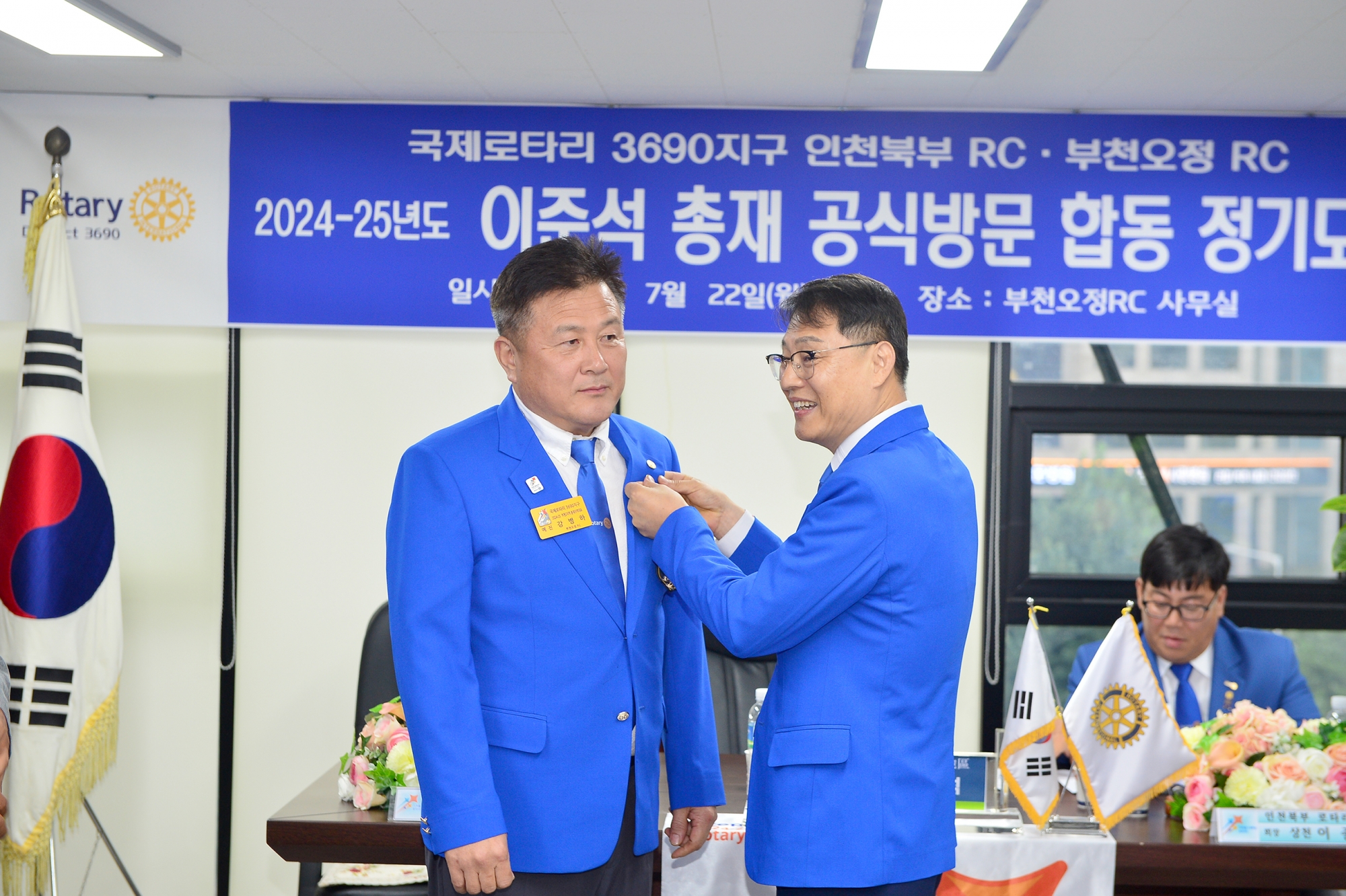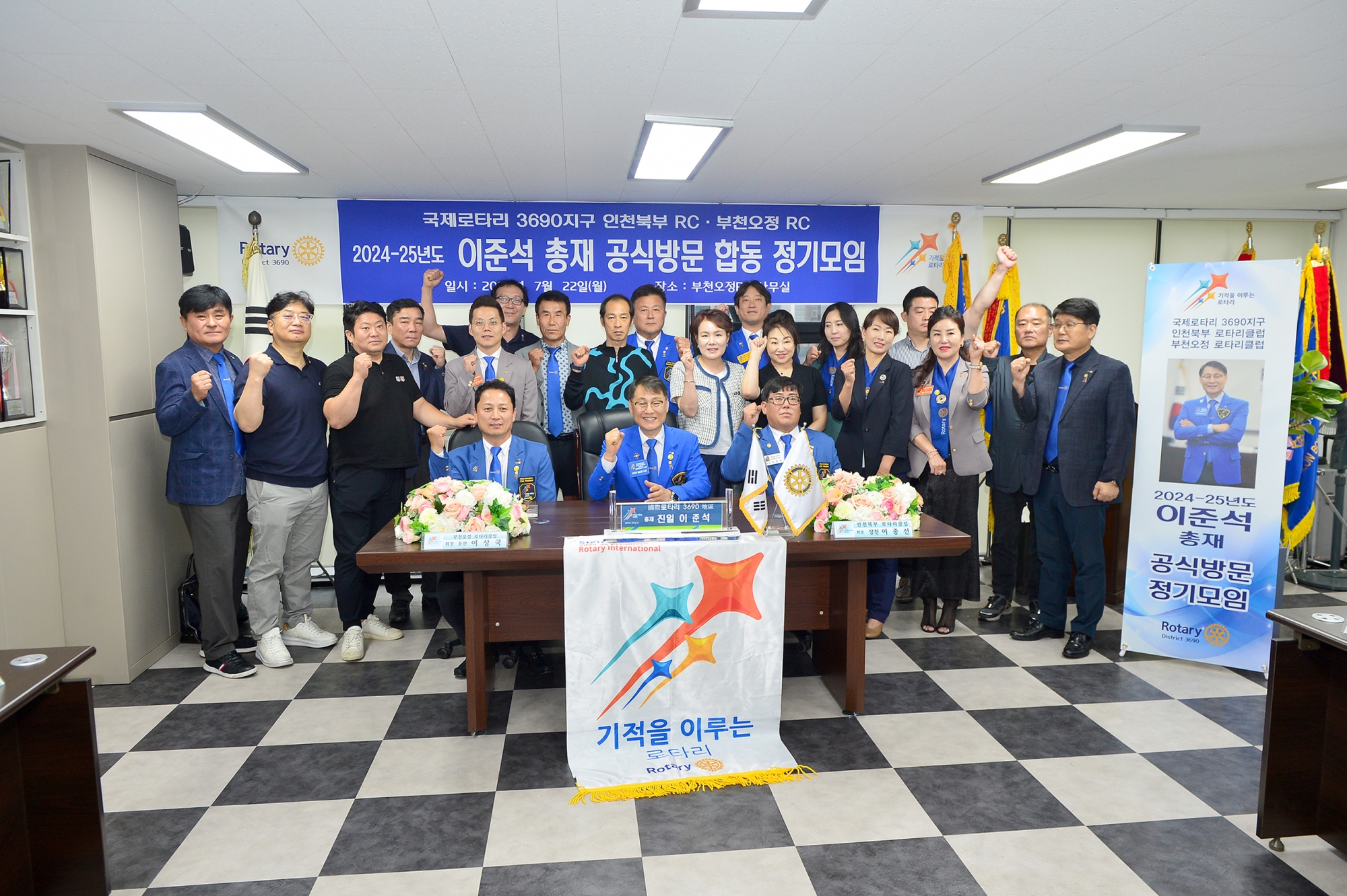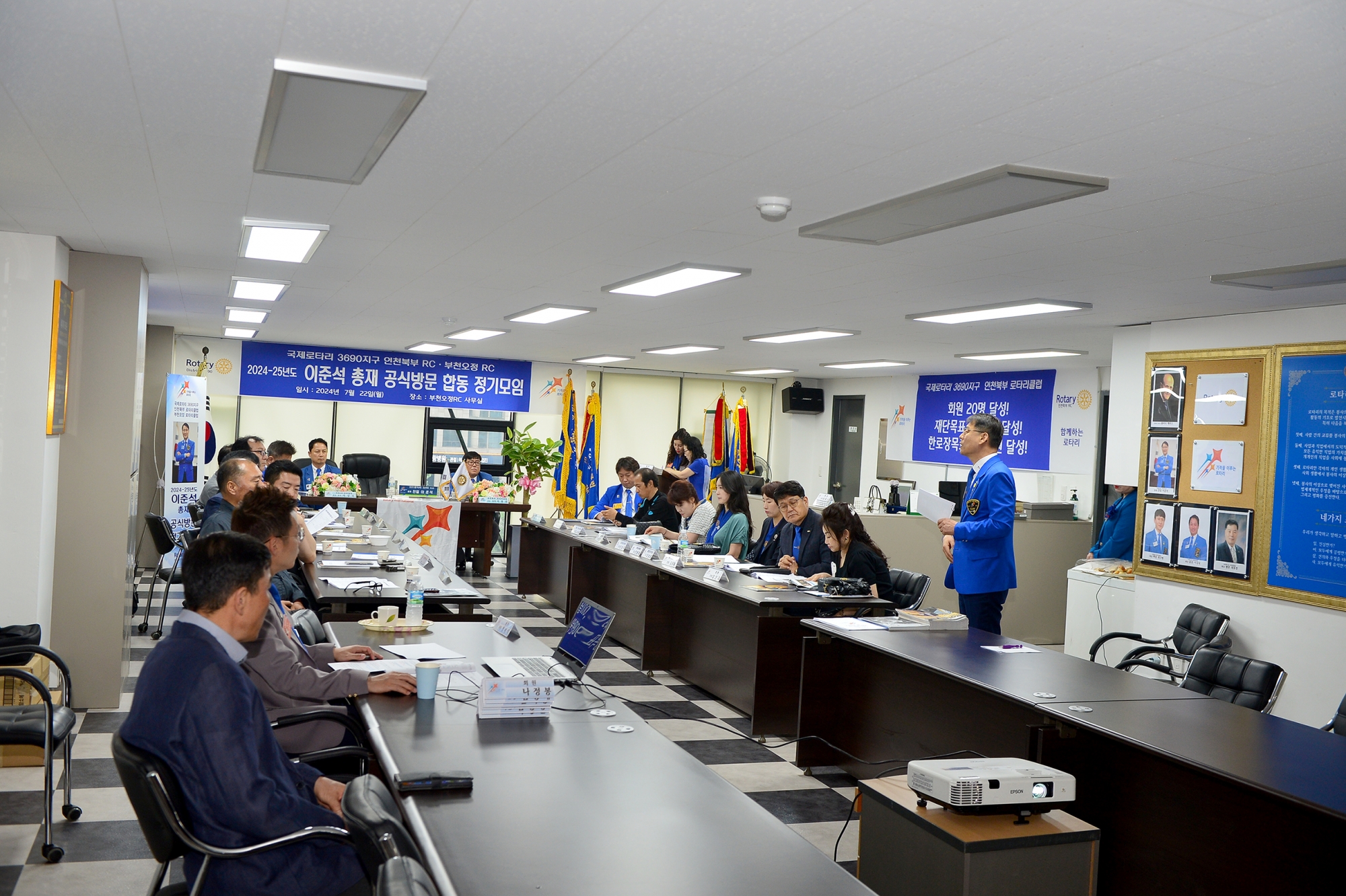 -내용: 부천오정 로타리클럽(회장 운산 이상국)과 인천북부 로타리클럽(회장 상천 이종선)은 자매클럽 합동으로 진일 이준석 총재님의 2024-25년도 첫 총재공식방문을 맞이하여 회장, 총무 간담회와 5대분과 위원회 발표를 하고 합동정기모임을 하였다.