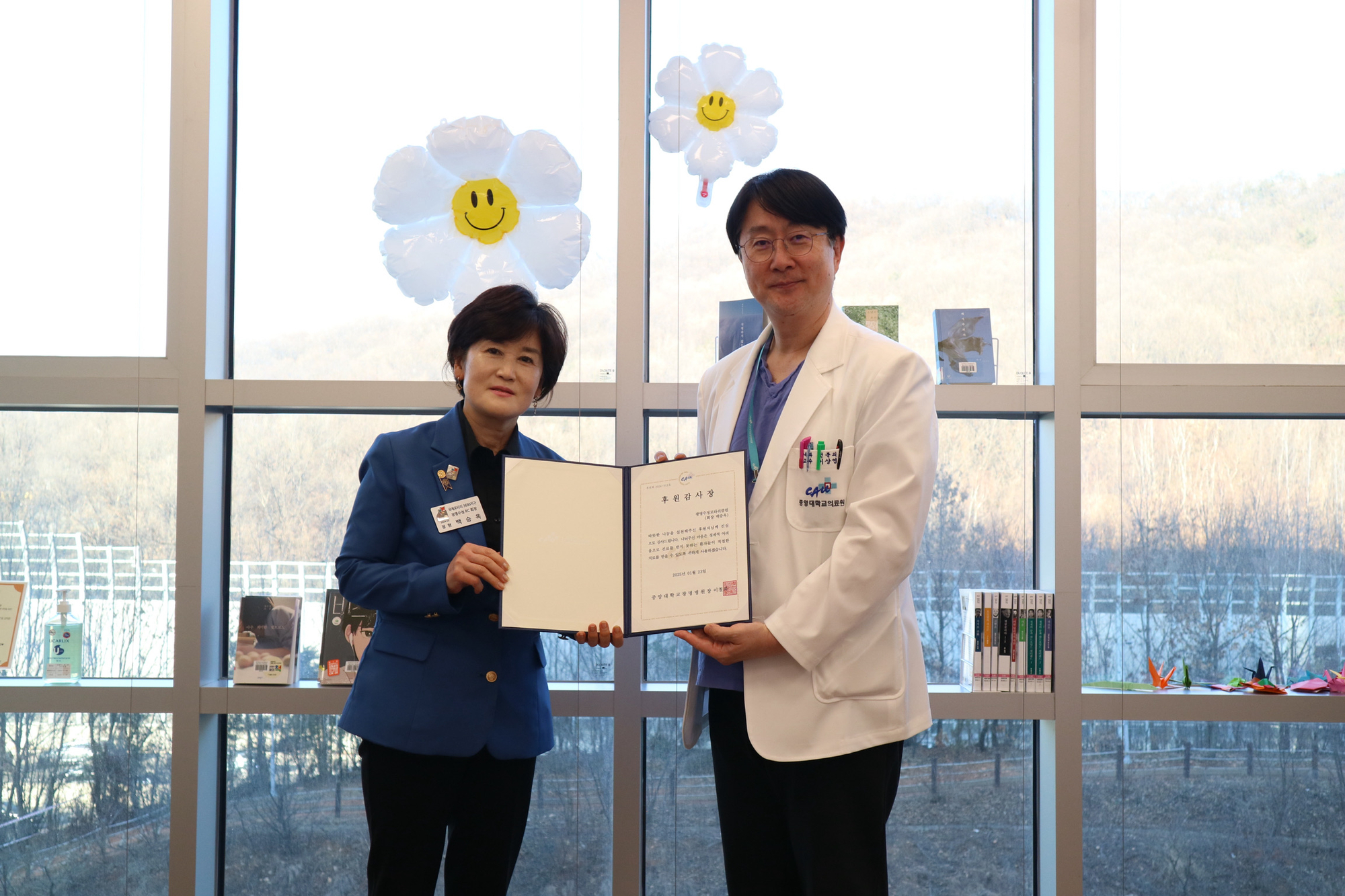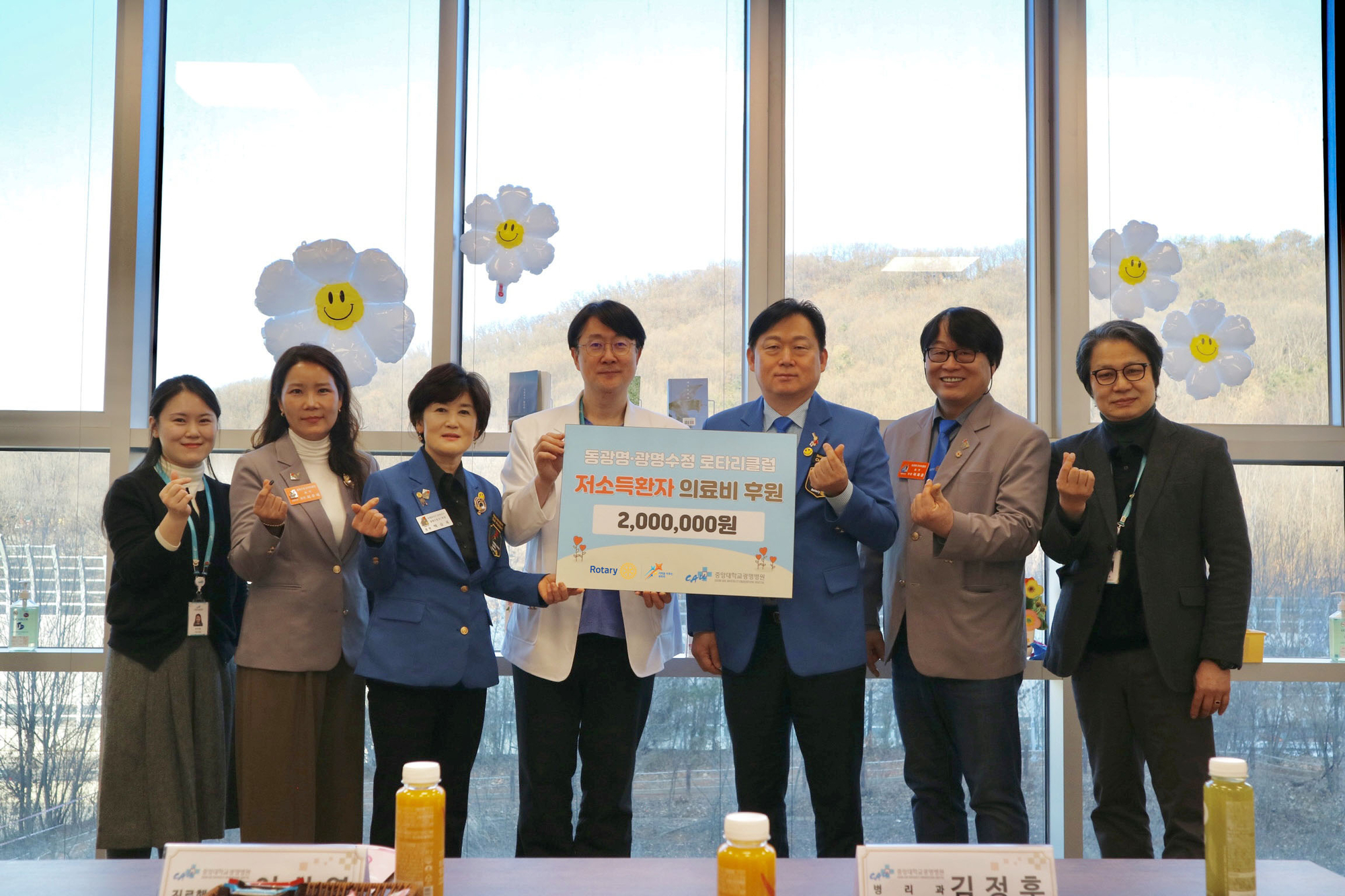 광명수정 로타리클럽 (회장 정현 백승옥)은 지구보조금사업으로 동광명로타리클럽과 함께 경제적인 어려움으로 치료비 부담을 가진 저소득층 중앙대학교광명병원 환자들에게 치료비를 후원하는 전달식을 진행하였습니다.
