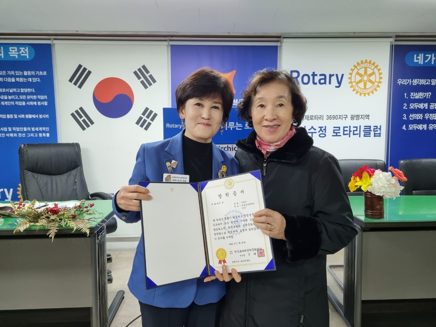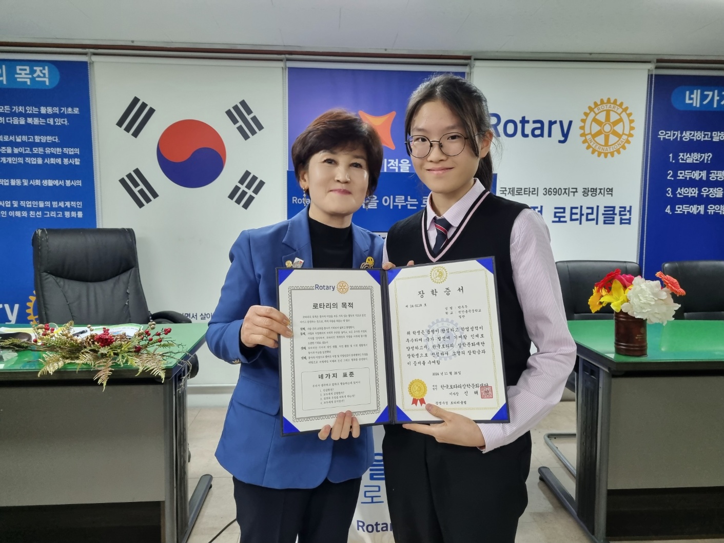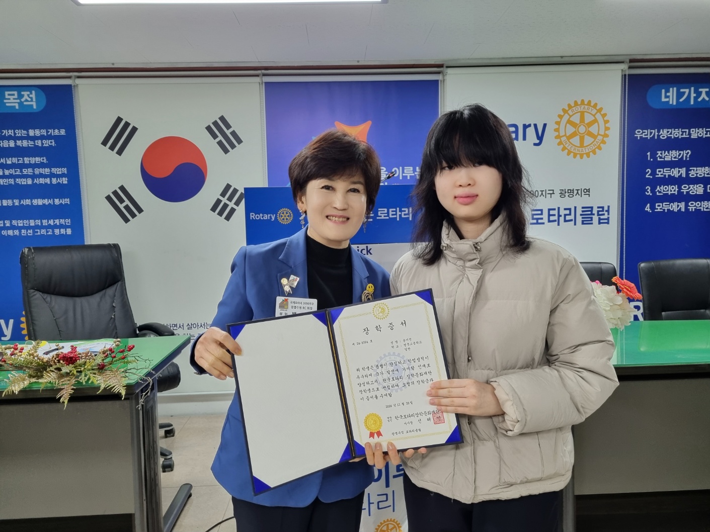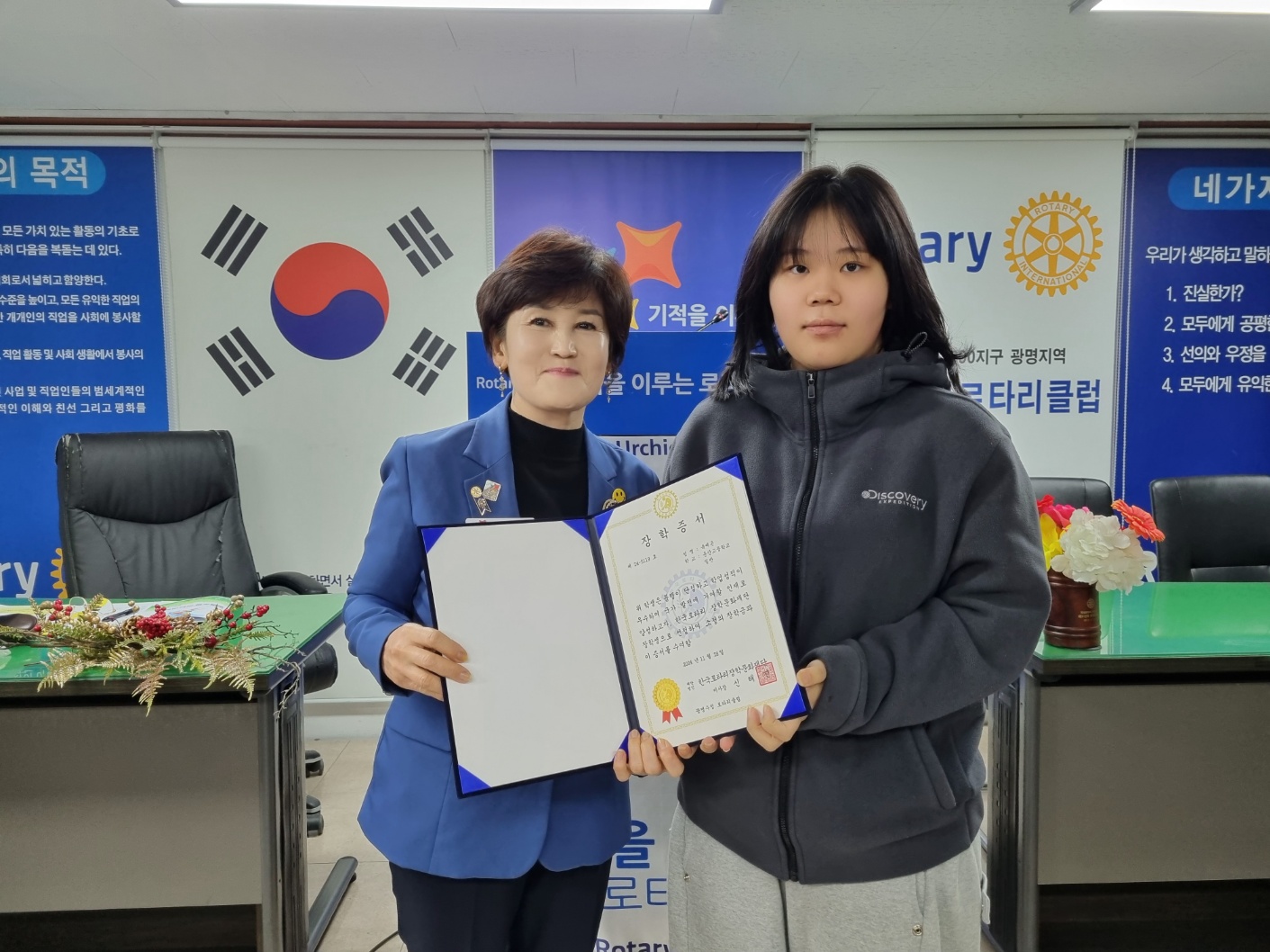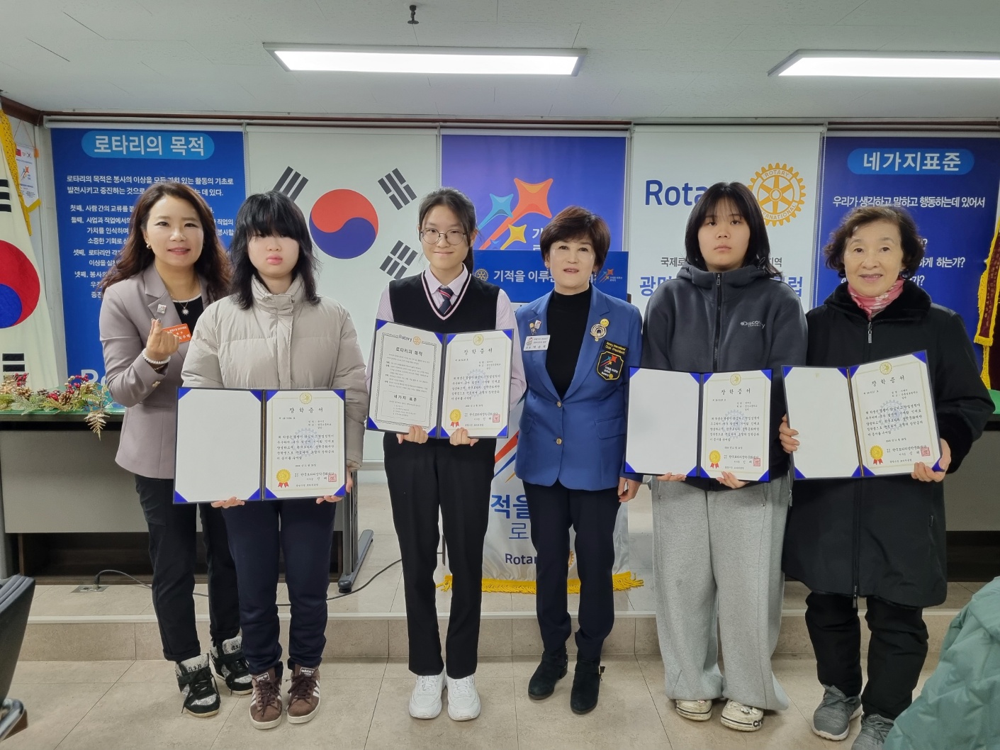 광명수정 로타리클럽 (회장 백승옥)은 2024년도 2학기 장학금 전달식에 클럽 장학금을 4명(용곡중학교 박우주 학생/ 한동글로벌학교 이예지 학생/ 운산고등학교 육예은학생/ 명문고등학교 윤서진 학생)에게 각 50만원 총 200만원을 지급 하였습니다.