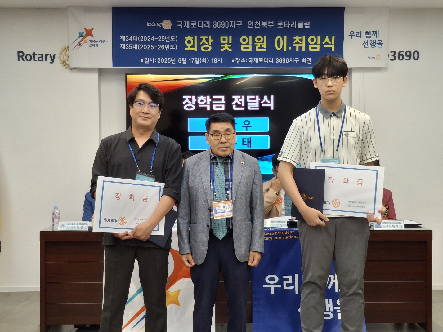 -내용: 인천북부 로타리클럽은 상천 이종선 회장님의 연임으로 임원 이취임식을 맞이하여 인천3지역 현, 차기 총재지역대표님과, 회원님들을 모시고 장학금 전달식 및 축하 행사를 진행하였습니다.