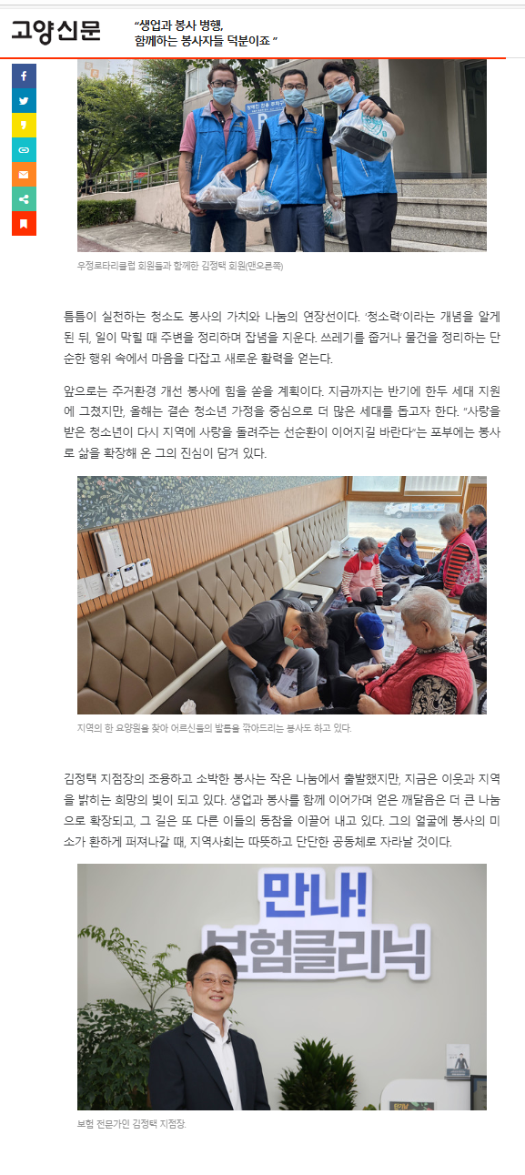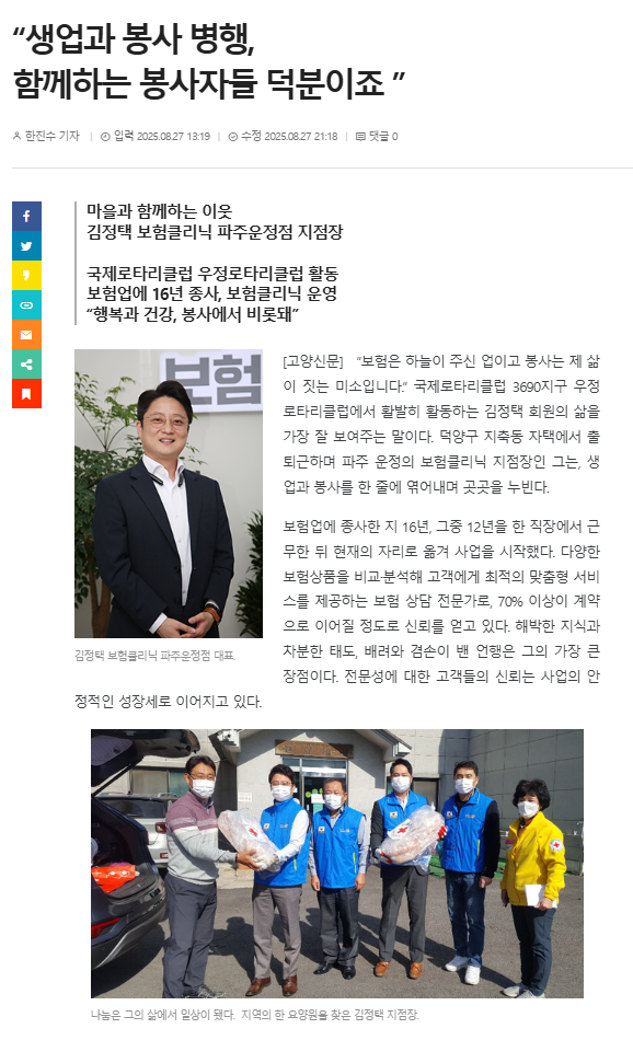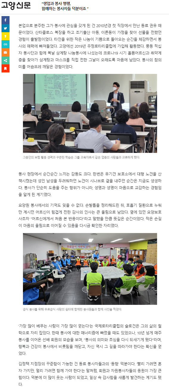 일산우정 로타리클럽 소속 대통 김정택회원님의 봉사활동이 고양신문에 게재 됐습니다.