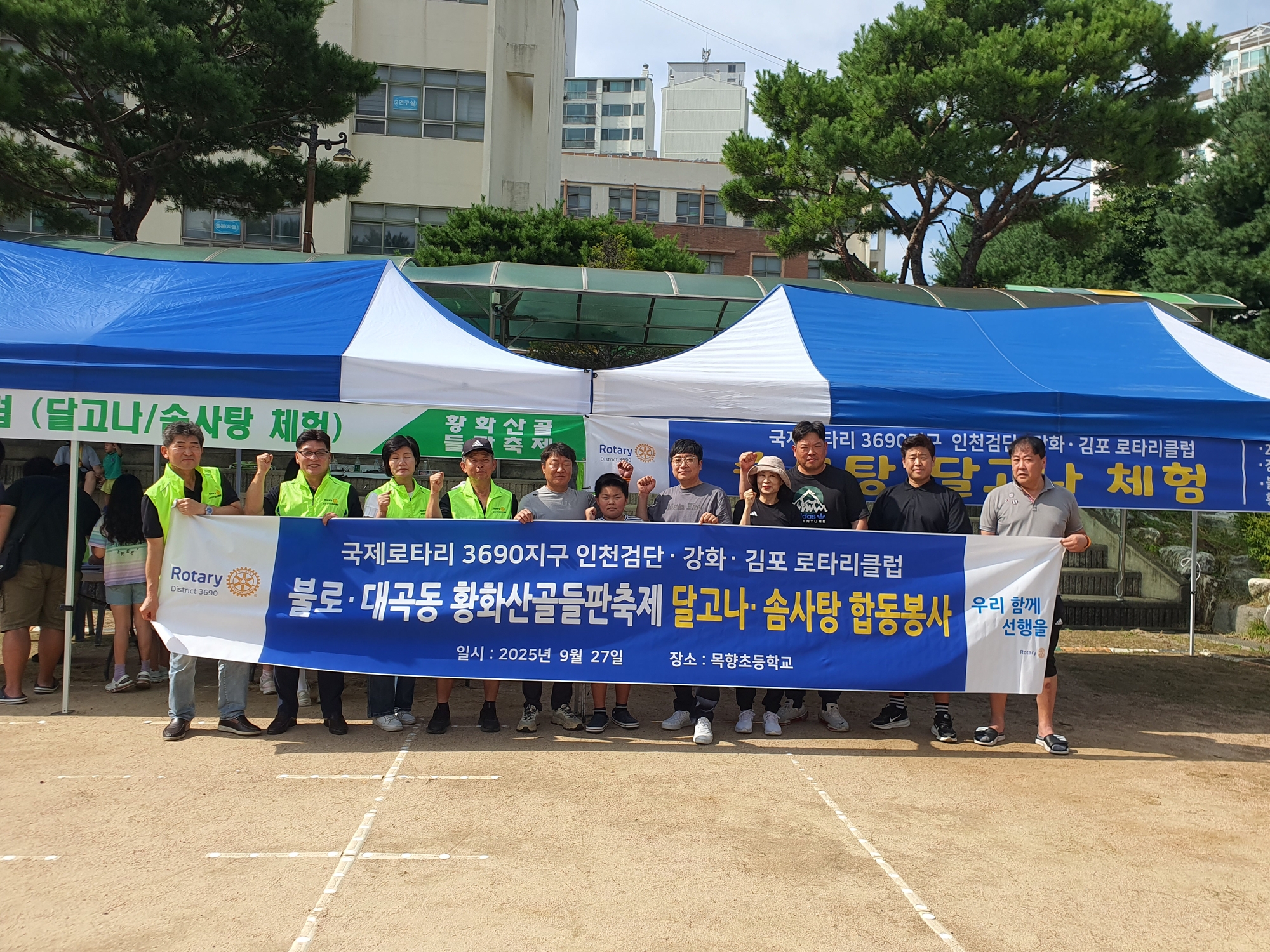 25년 9월 27일(토) 불로 대곡동 목향초등학교에서 황화산골 들판축제시 인천검단.강화.김포로타리클럽 합동으로 지역주민을 위한 달고나 솜사탕 봉사 코너를 운영하였습니다.
