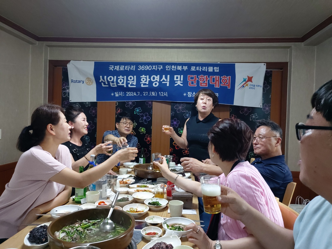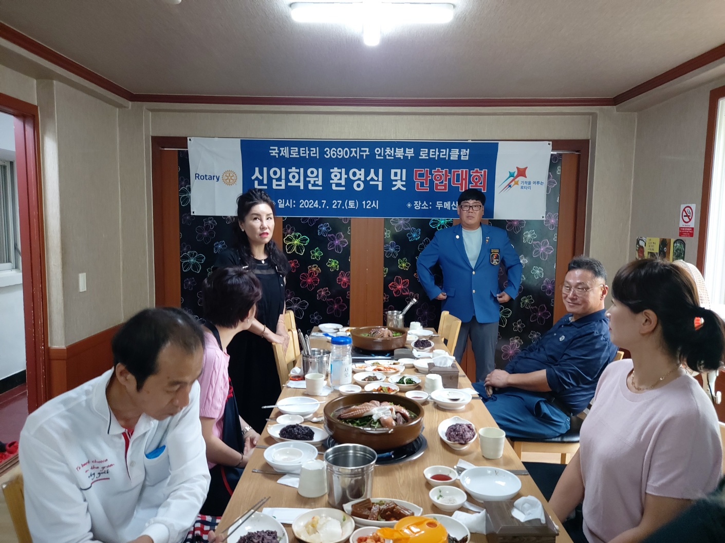 -내용: 인천북부 로타리클럽(회장 상천 이종선)은 입회하신 회원님(축복 임인자)께 환영식을 갖고 뺏지를 달아드리고 단합을 도모하는 자리를 통해 7월 말까지 PHF-5명, EREY-10명으로 전회원이 로타리재단 참여에 약속을 하였다