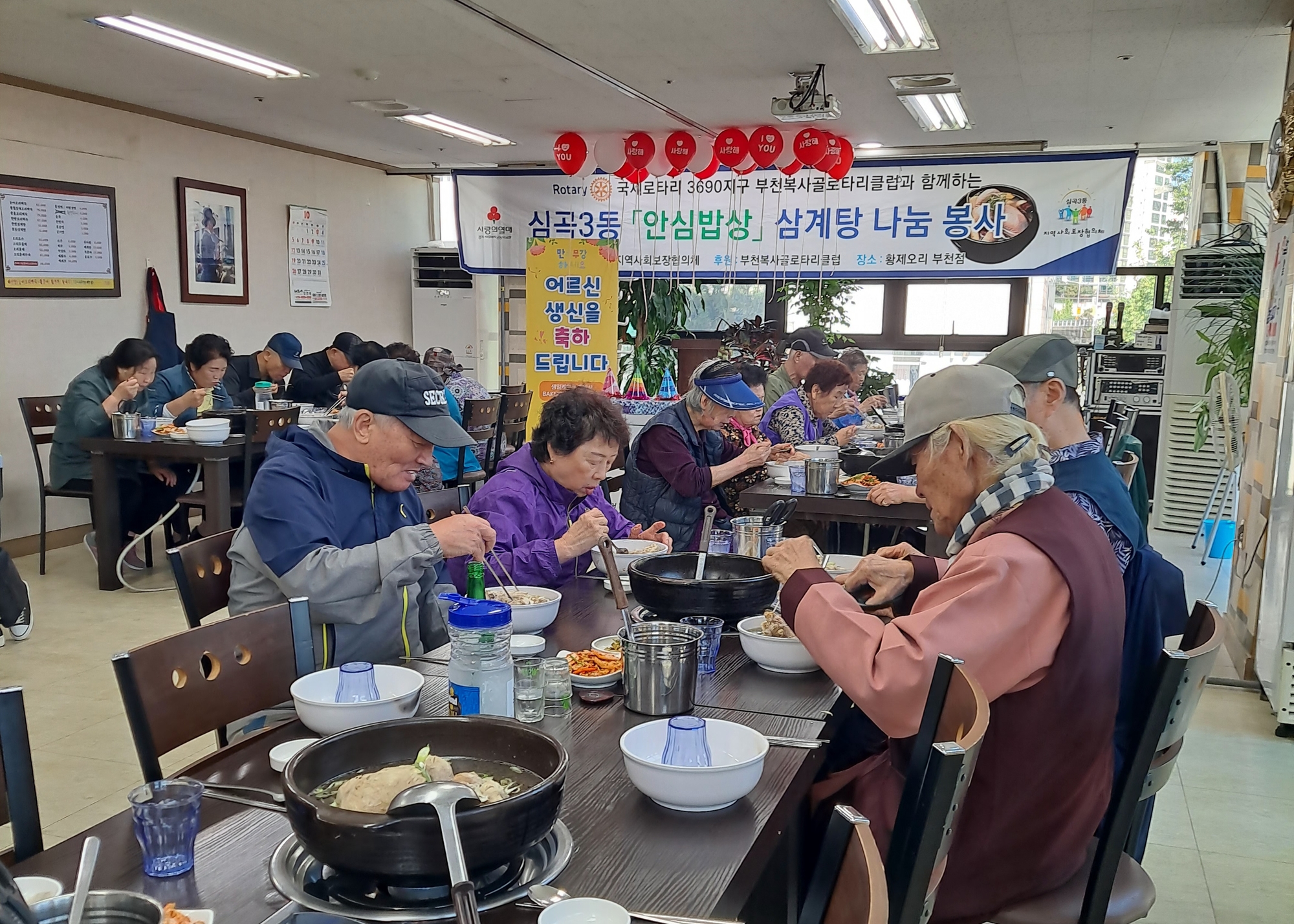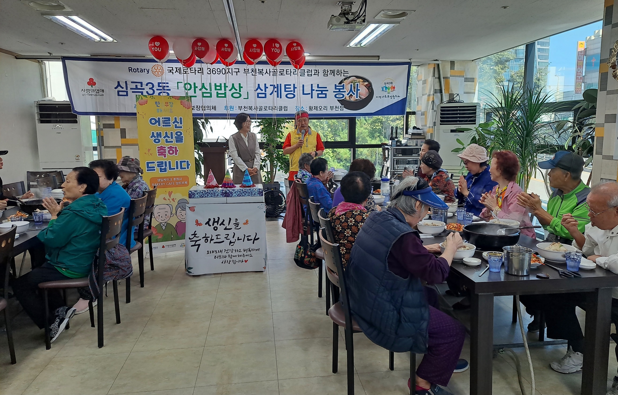 심곡3동 30명은 황제오리 사업장으로 모셔서 한방삼계탕 대접과 10월달 생신인 3분께 생신 축하 파티로 봉사 활동을 하였습니다.