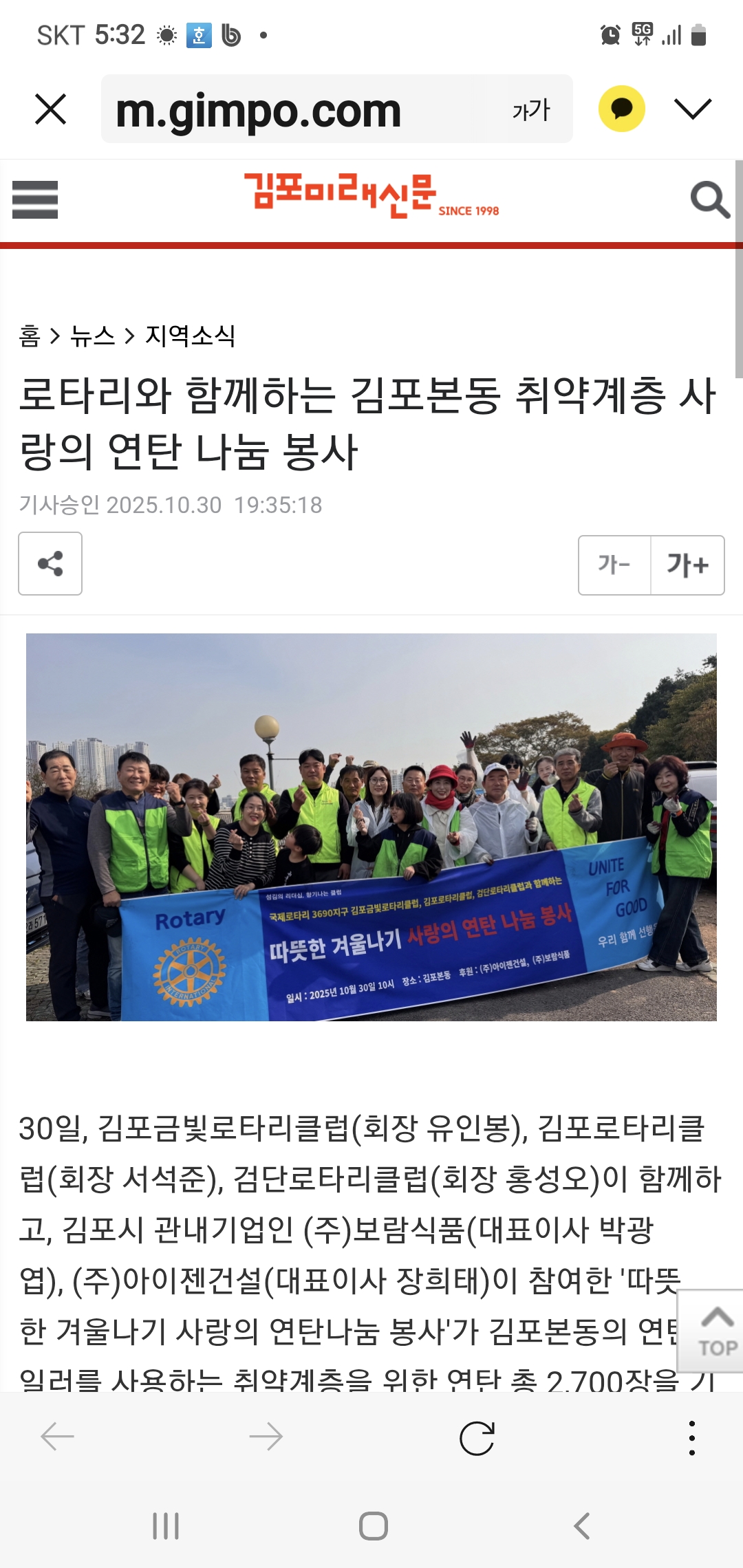 25년 1월 30일자 김포미래신문에 합동 김포지역 취약계층 사랑의 연탄 봉사 기사를 게제하여 봉사활동을 홍보하였습니다.
