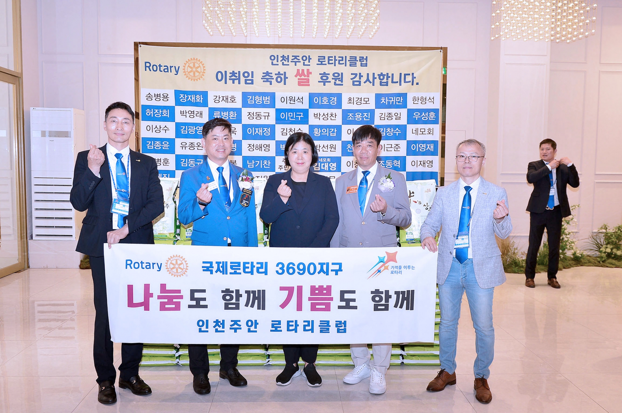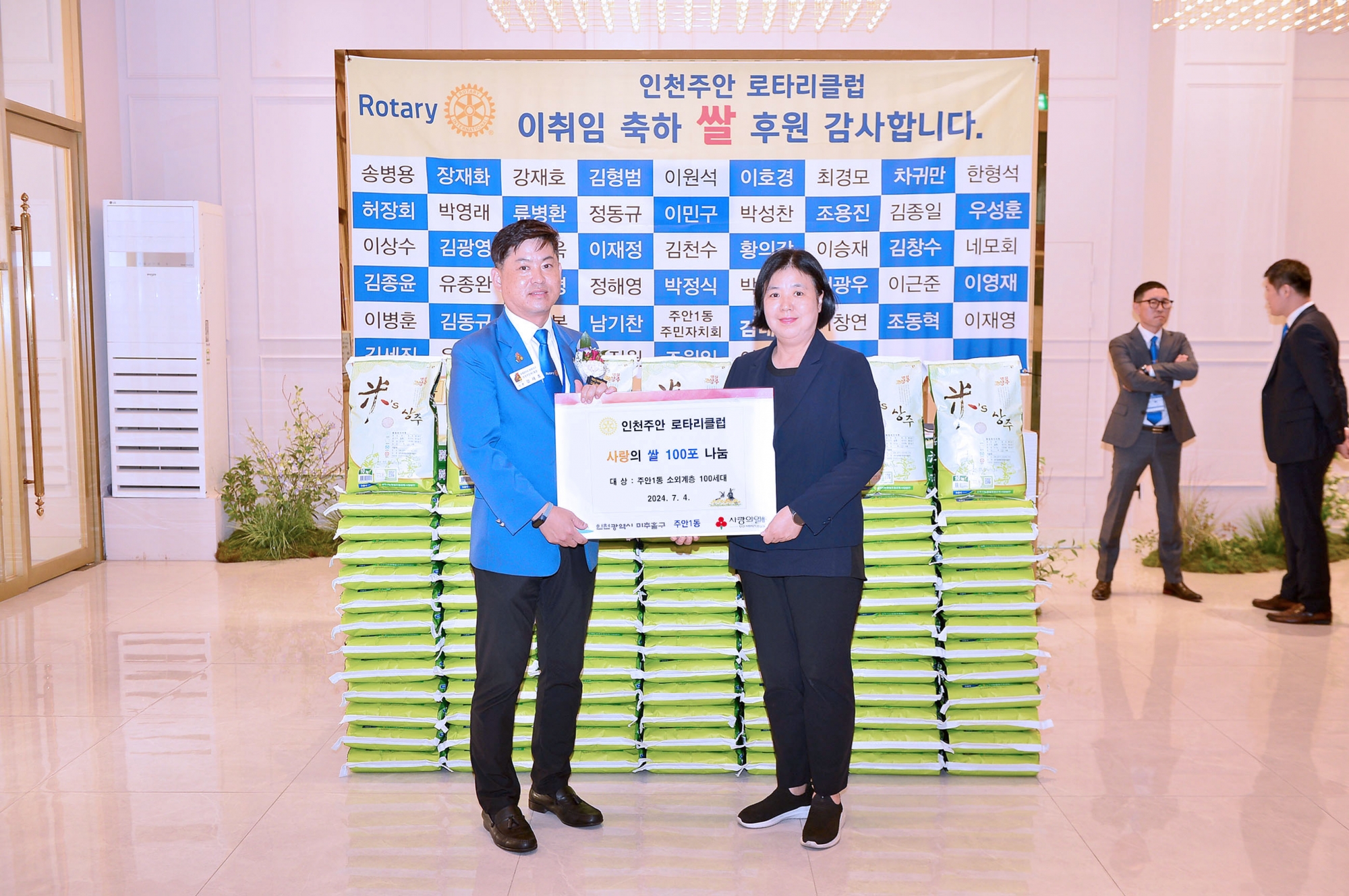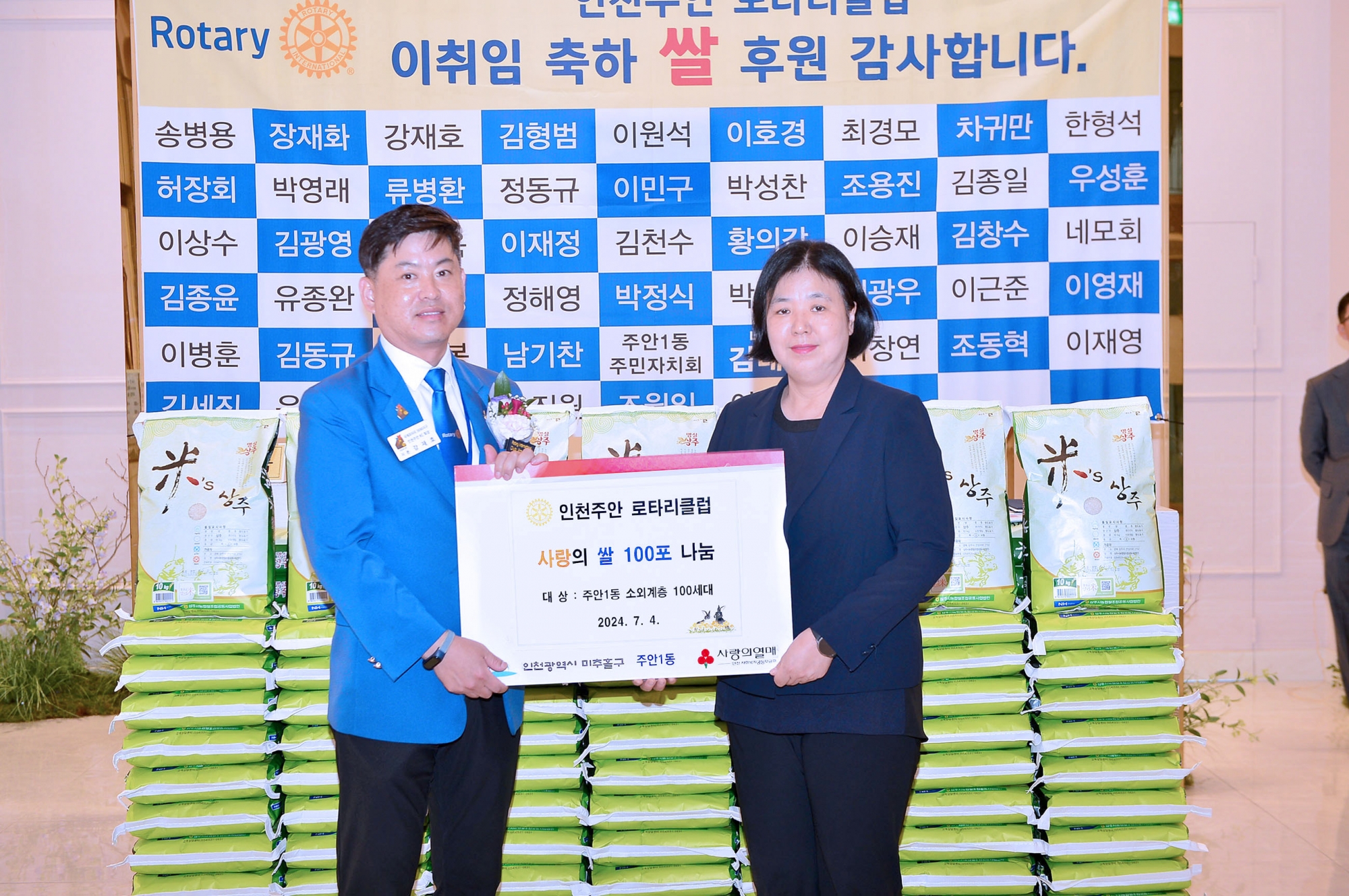 인천주안 RC(회장 강재호)는 7월 4일 회장 이취임식에 어려운 이웃을 돕기 위해 화환대신 쌀로 기부받아 주안1동 행정복지센터에 쌀1000Kg(10KgX100포)을 전달하여 독거어르신, 저소득가정에 후원하였습니다.