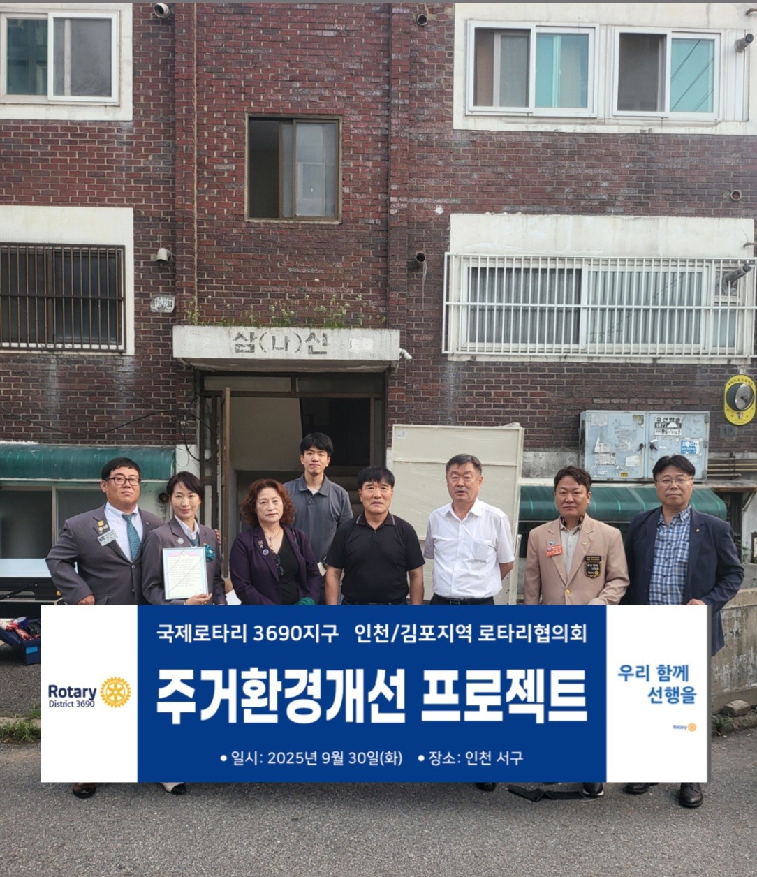 인천ㆍ김포지역 로타리협의회는 지난 9월 30일 인천 서구 석남동 소재 여름철 폭우로 인해 지하가 침수된 소녀가장을 돕기위해, 인천서곶 RC, 김포 RC, 동인천월미 RC, 인천주안 RC, 인천검단 RC, 인천은하수 RC, 강화 RC 합동으로 주거환경개선 소녀가장 지원사업에 참여하였다.